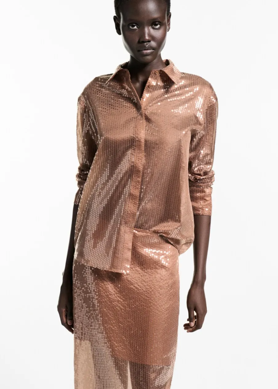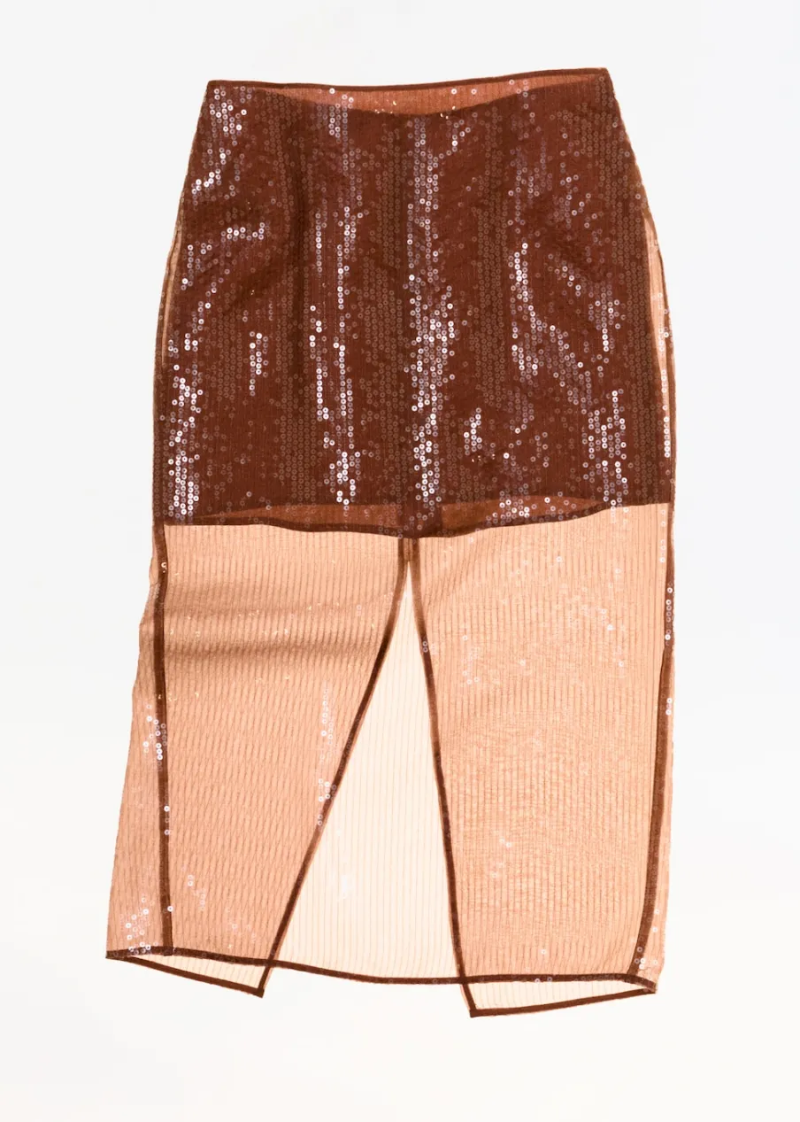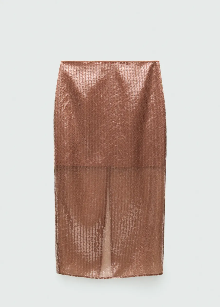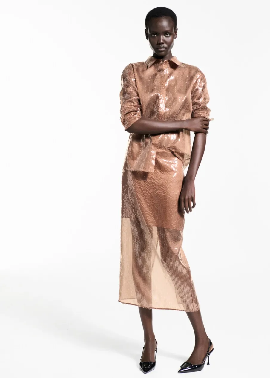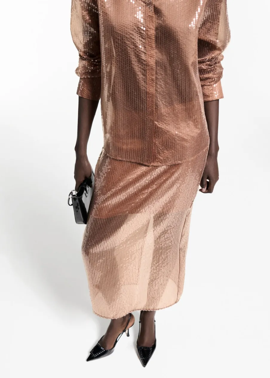 Średni stan. Model prosty. Krój do kolan. Podszewka. Bez zapięcia. Total look. Modelka ma 177 cm wzrostu i nosi rozmiar S/36. Modelka ma 178 cm wzrostu i nosi rozmiar S/36. Kolekcja wizytowa. Tkanina z cekinami.