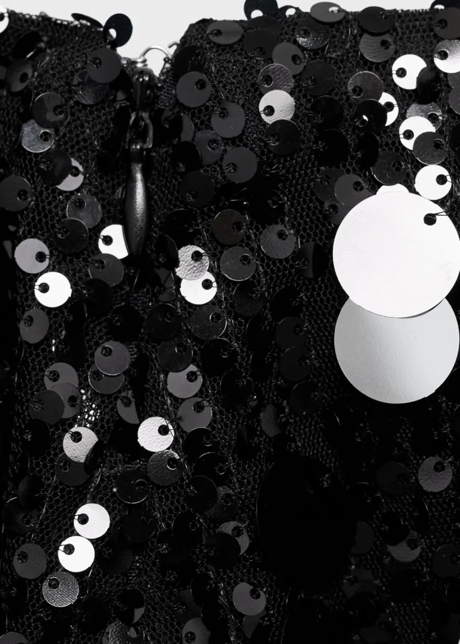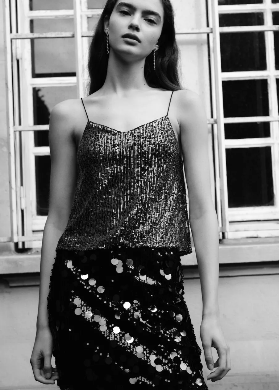Cekinowa tkanina. Krótki krój. Model prosty. Wewnętrzna podszewka. Zapięcie z boku. Kolekcja wieczorowa i imprezowa. Party Collection.