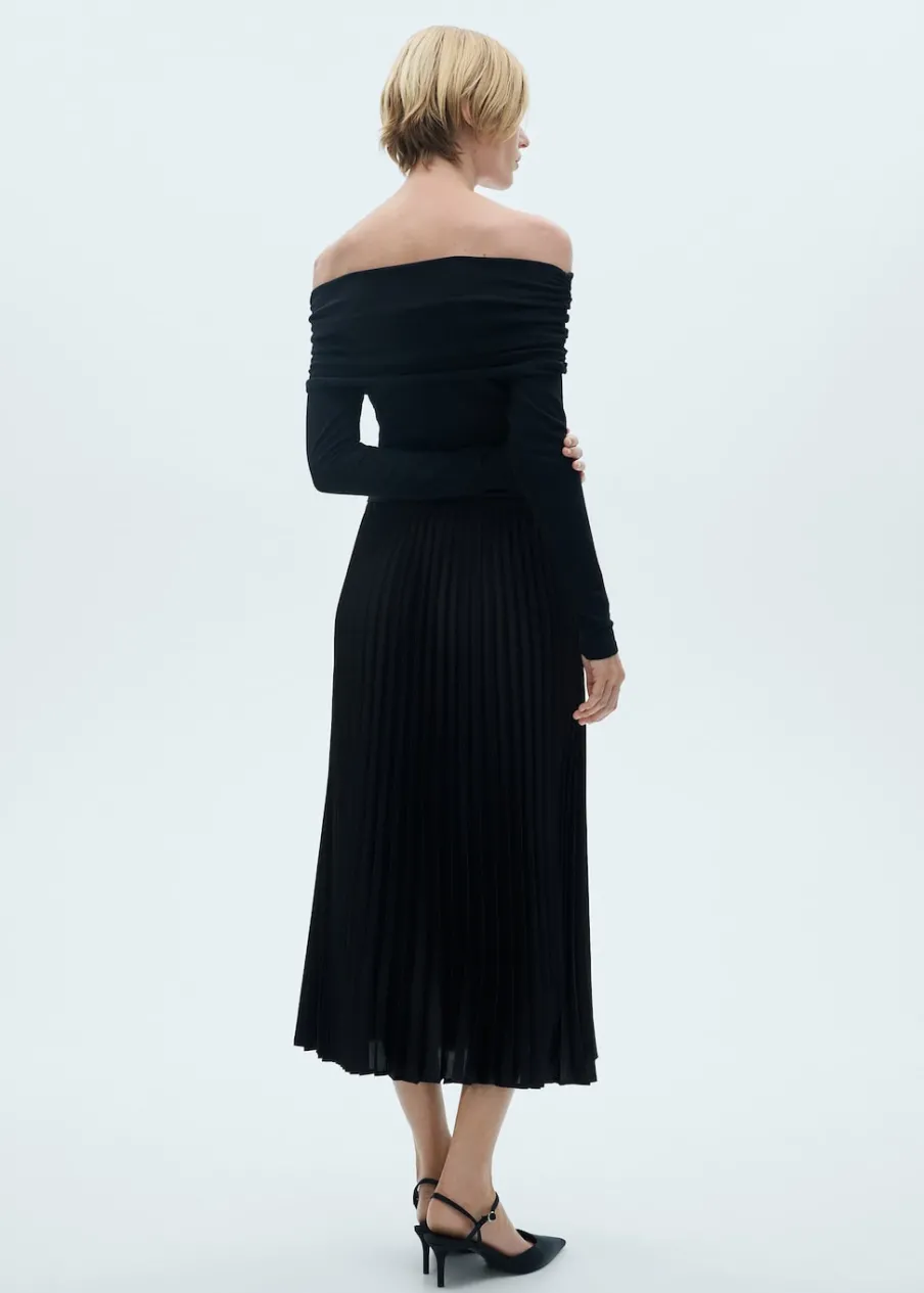 Lejąca tkanina. Podwyższony stan. Model evasé. Model długi. Plisowanie. Elastyczny pas. Wewnętrzna podszewka. Modelka ma 181 cm wzrostu i nosi rozmiar S/36.