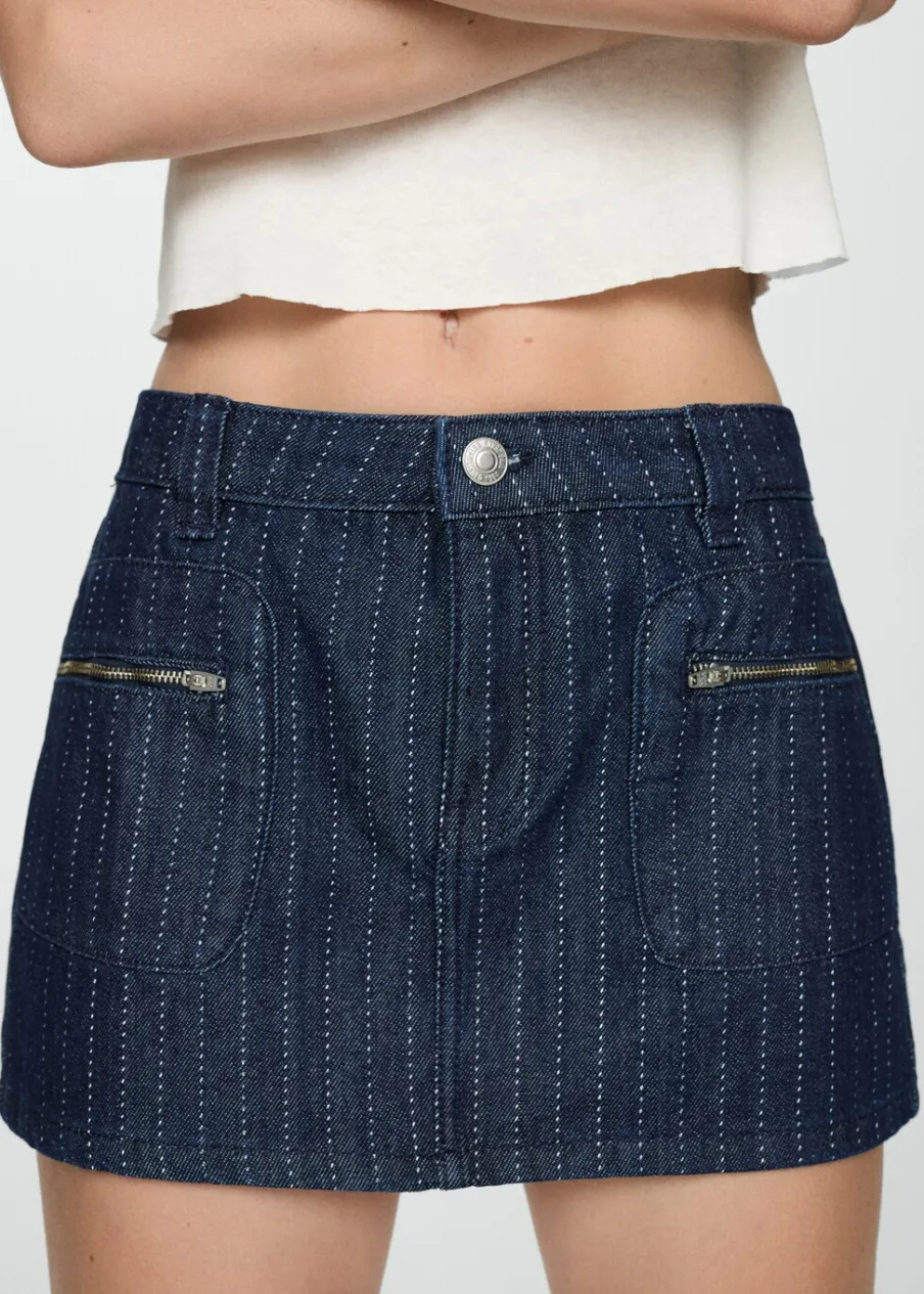 OpisTkanina bawełniana w dżinsowym stylu. Krótki krój. Deseń w prążki. Niski stan. Dwie kieszenie zapinane na suw…