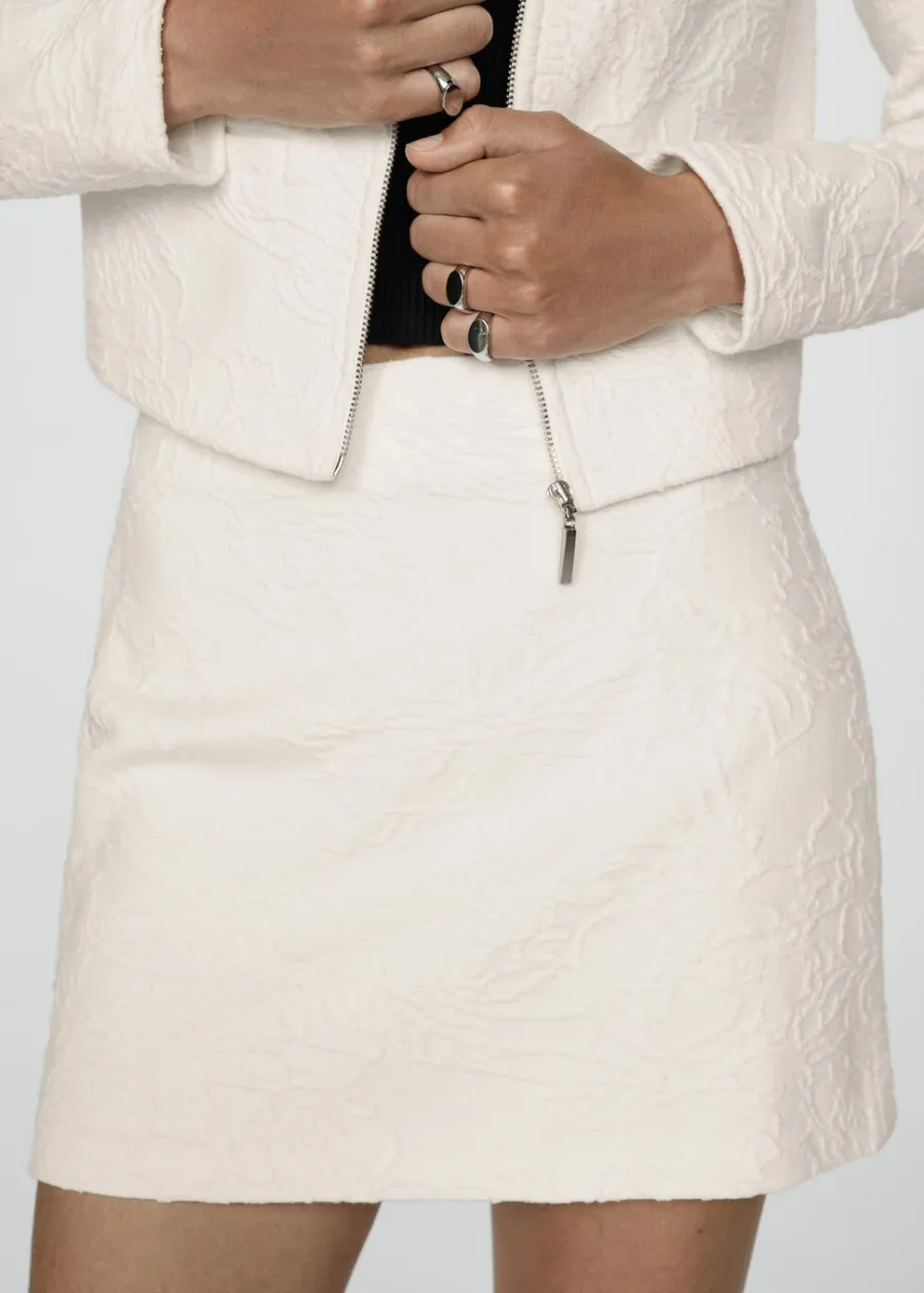 Tkanina mieszanka bawełny. Teksturowana tkanina. Krótki krój. Model prosty. Kryte zapięcie na zamek z boku. Wewnętrzna podszewka. Total look. Modelka ma 180 cm wzrostu i nosi rozmiar S.