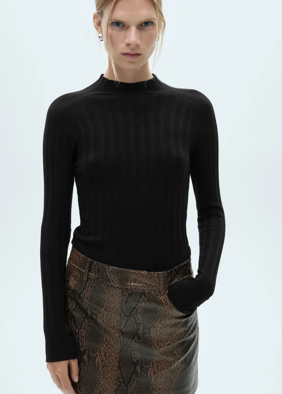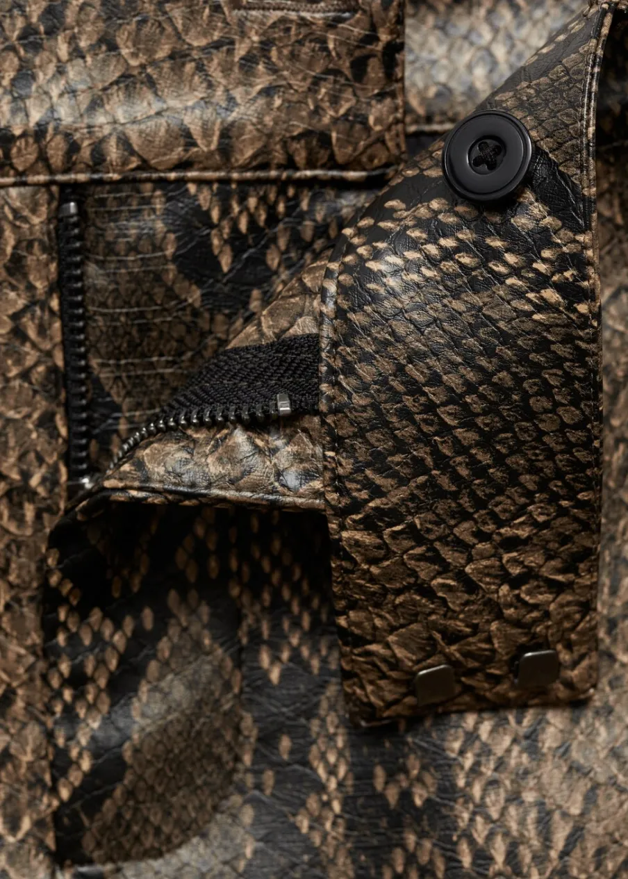 Efekt wężowej skóry. Średni stan. Krótki krój. Model prosty. Dwie kieszenie boczne. Szlufki. Modelka ma 178 cm wzrostu i nosi rozmiar S/36. Zapięcie na zamek i guzik z przodu.