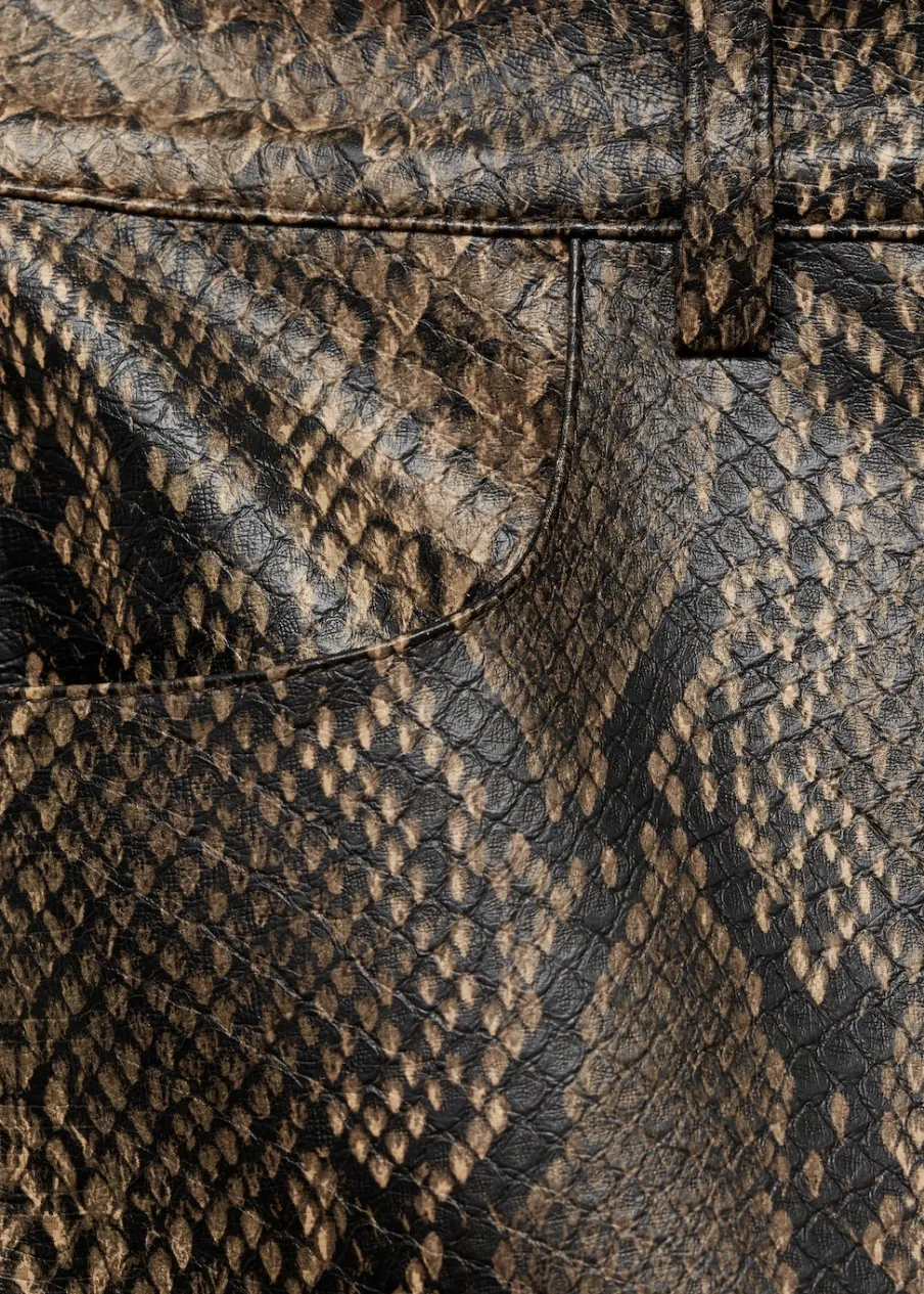 OpisEfekt wężowej skóry. Średni stan. Krótki krój. Model prosty. Dwie kieszenie boczne. Szlufki. Modelka ma 178 cm…