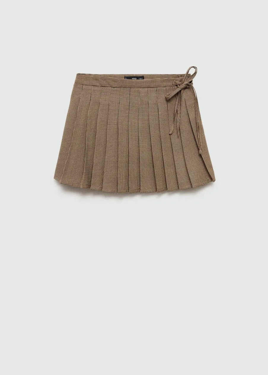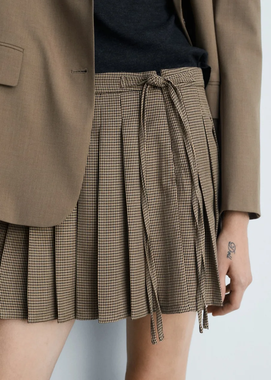 Średni stan. Model evasé. Krótki krój. Fason z zakładkami. Model prosty. Deseń kurza stopka. Boczne zapięcie na suwak. Wiązanie z boku. Wewnętrzna podszewka. Modelka ma 178 cm wzrostu i nosi rozmiar S/36.