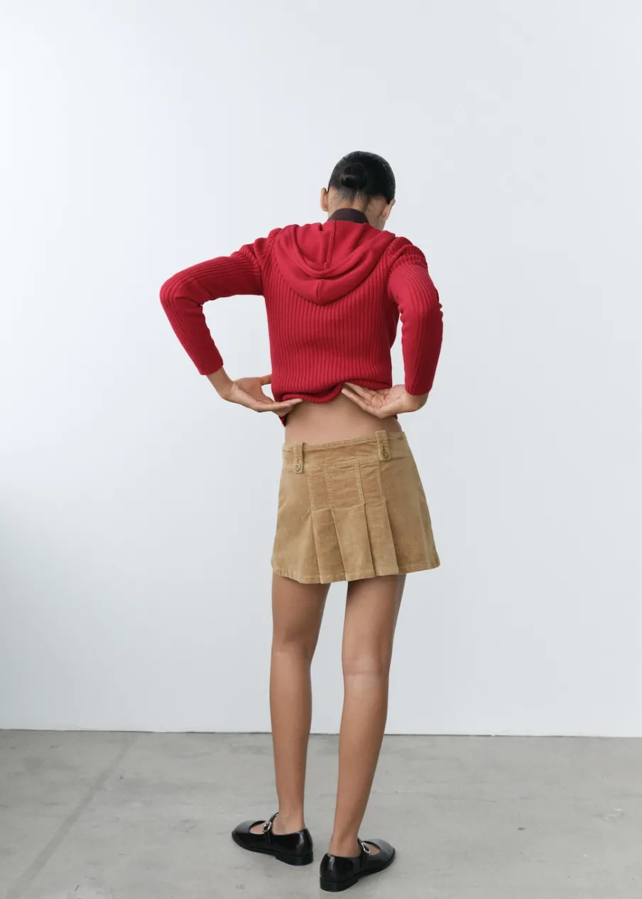 Sztruksowa tkanina. Fason z zakładkami. Krótki krój. Niski stan. Szlufki. Kieszenie boczne. Zapięcie na zamek z boku. Modelka ma 178 cm wzrostu i nosi rozmiar S/36.