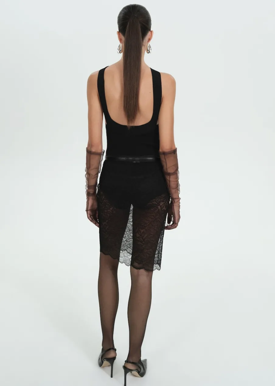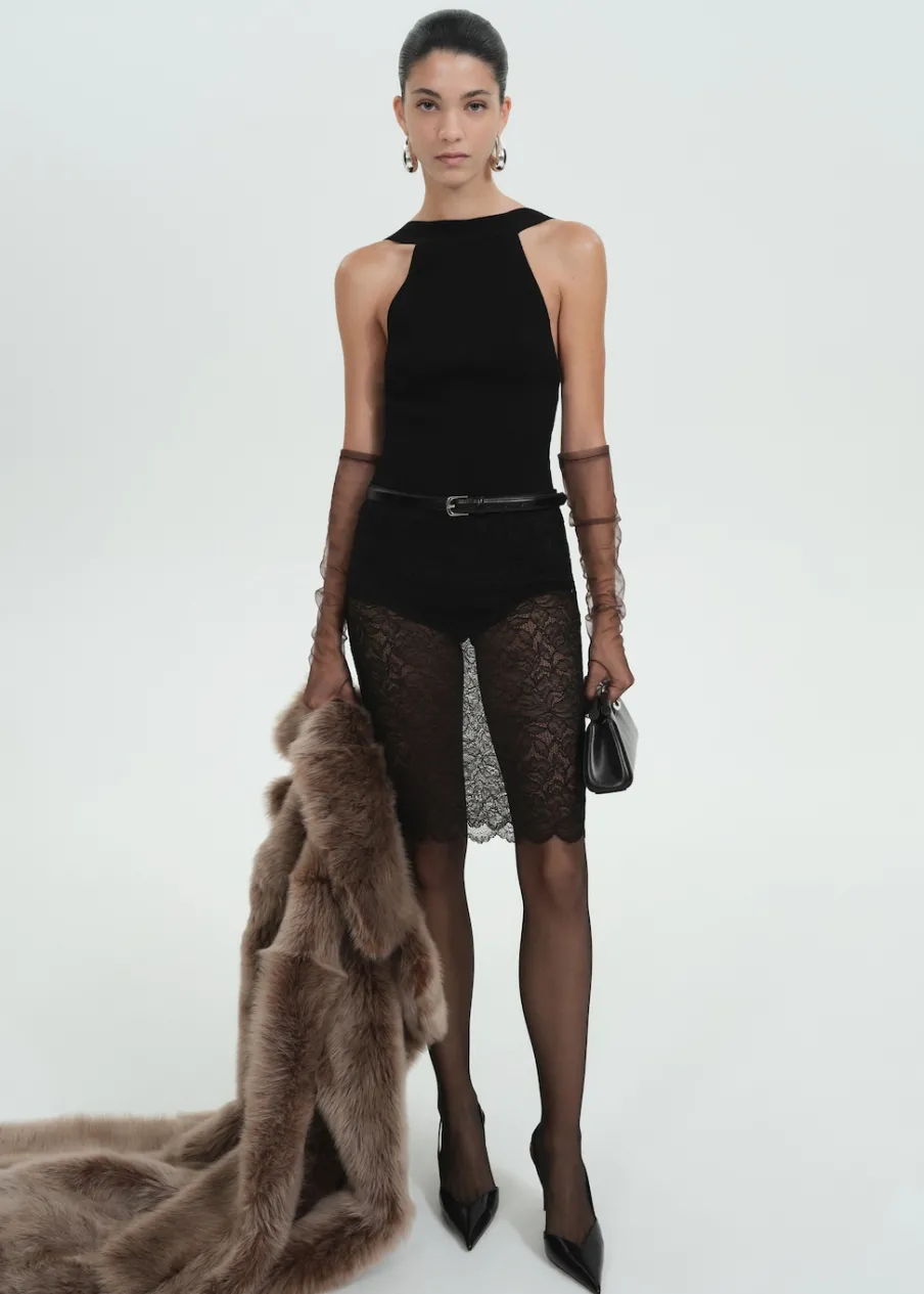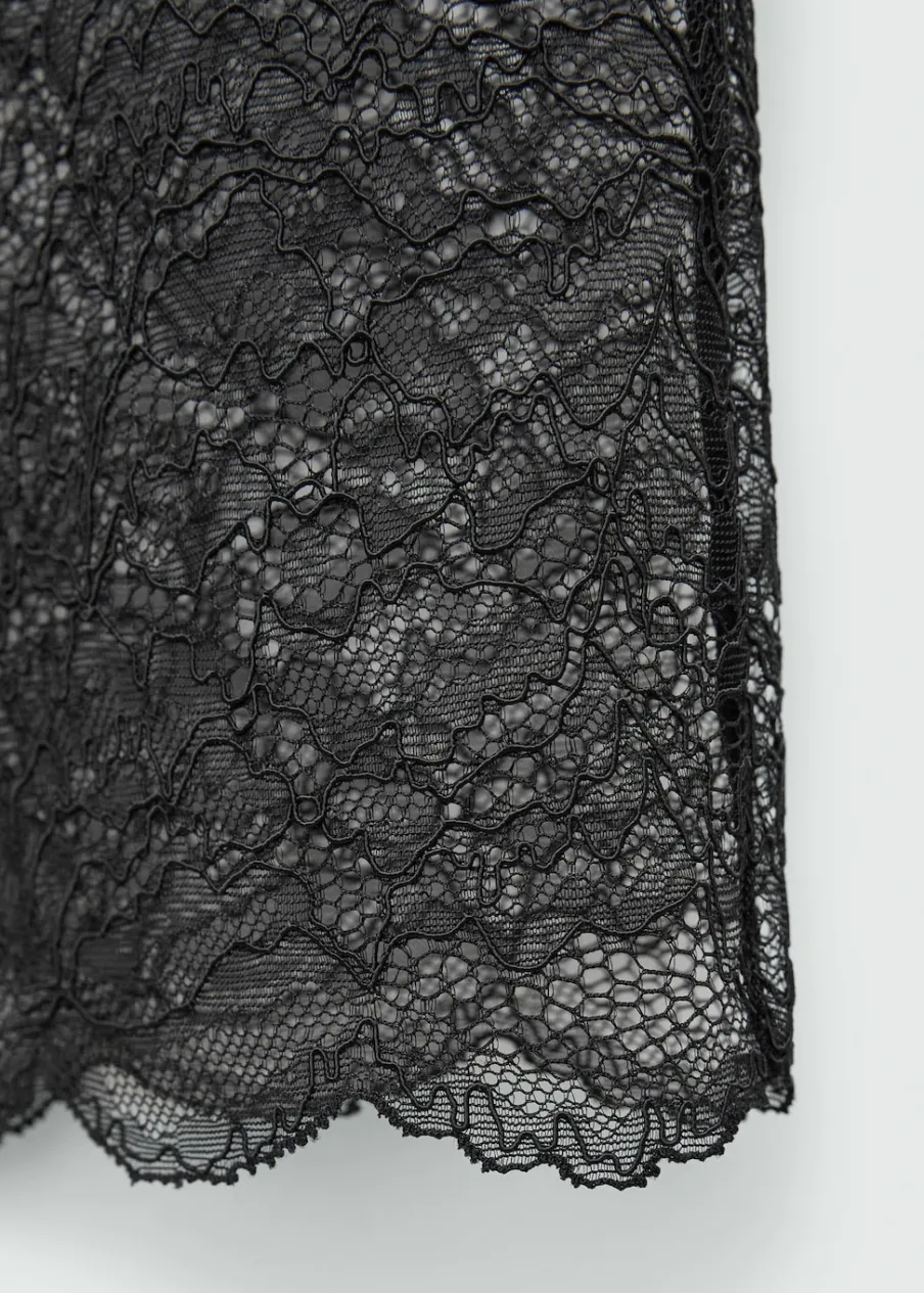 Gipiurowa tkanina. Półprzezroczysta tkanina. W bieliźnianym stylu. Model prosty. Krój do kolan. Bez podszewki. Elastyczny pas. Modelka ma 177 cm wzrostu i nosi rozmiar S/36. Kolekcja wizytowa. Kolekcja Selection.