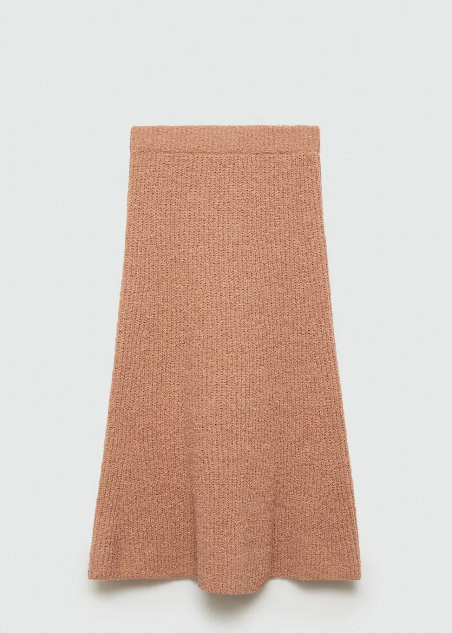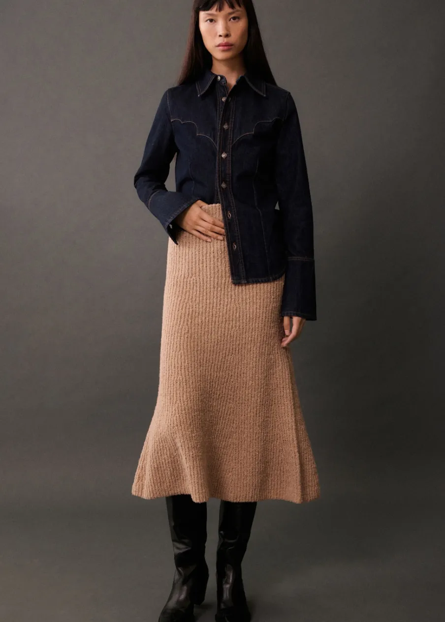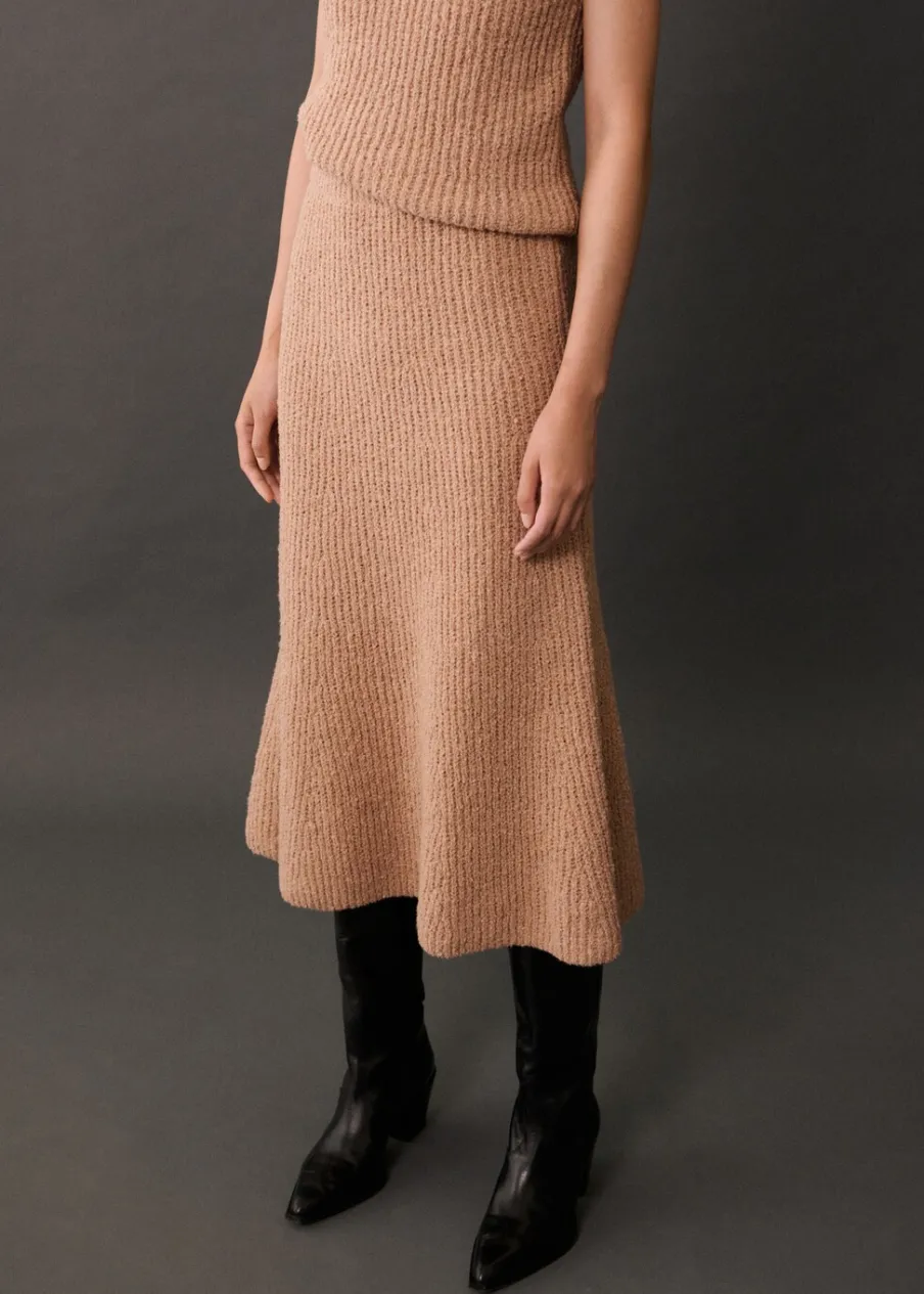 Tkanina ze ściągaczowej dzianiny. Model długi. Model evasé. Średni stan. Elastyczny pas. Total look. Modelka ma 177 cm wzrostu i nosi rozmiar S/36.