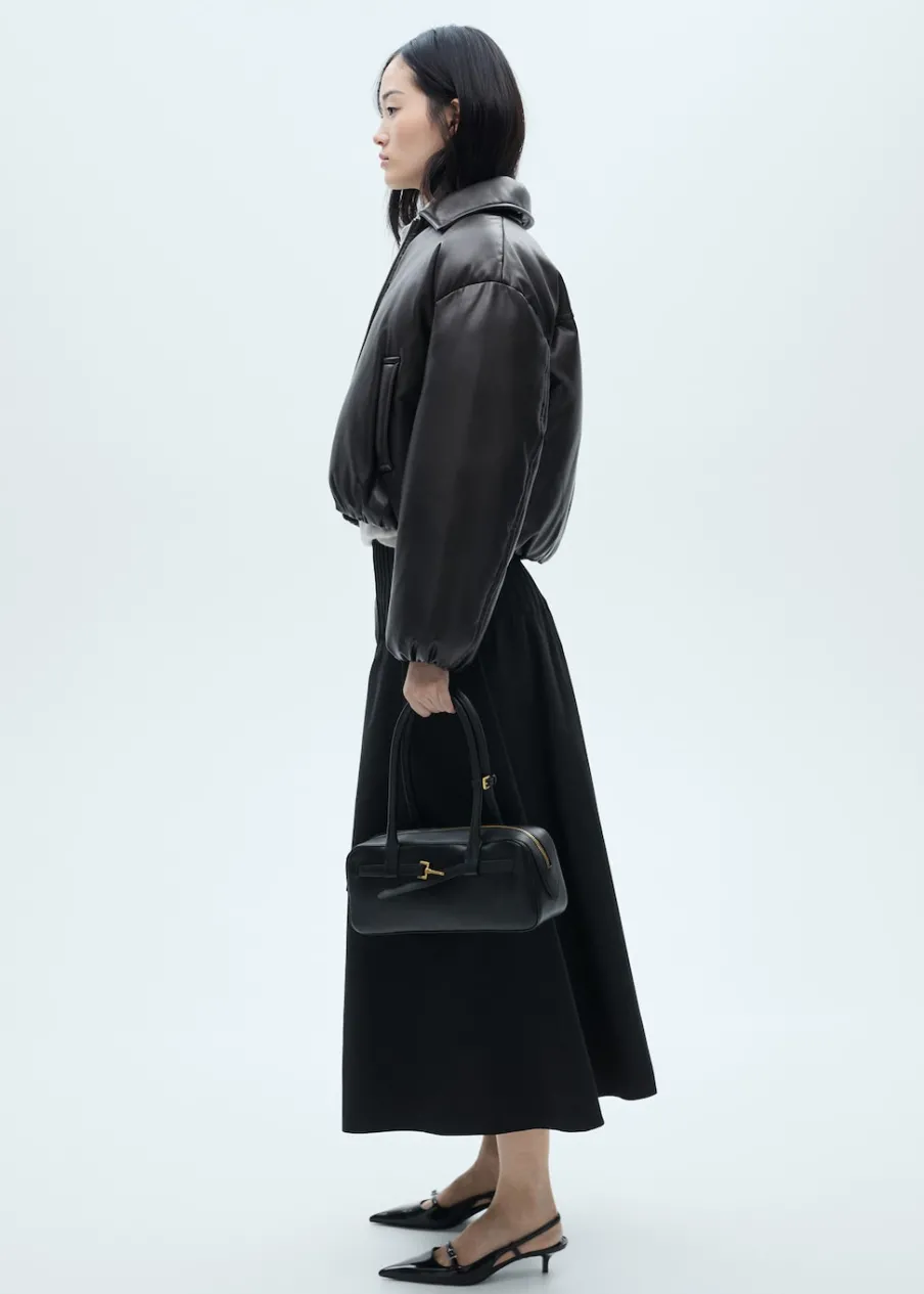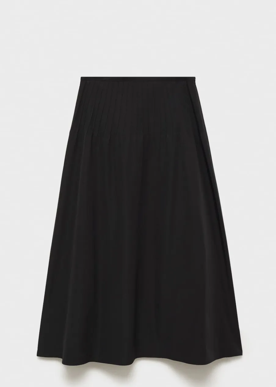 Tkanina mieszanka bawełny. Model evasé. Model długi. Podwyższony stan. Zapięcie na zamek z boku. Detal z zakładkami. Modelka ma 175 cm wzrostu i nosi rozmiar S/36.