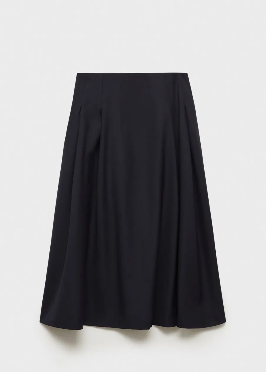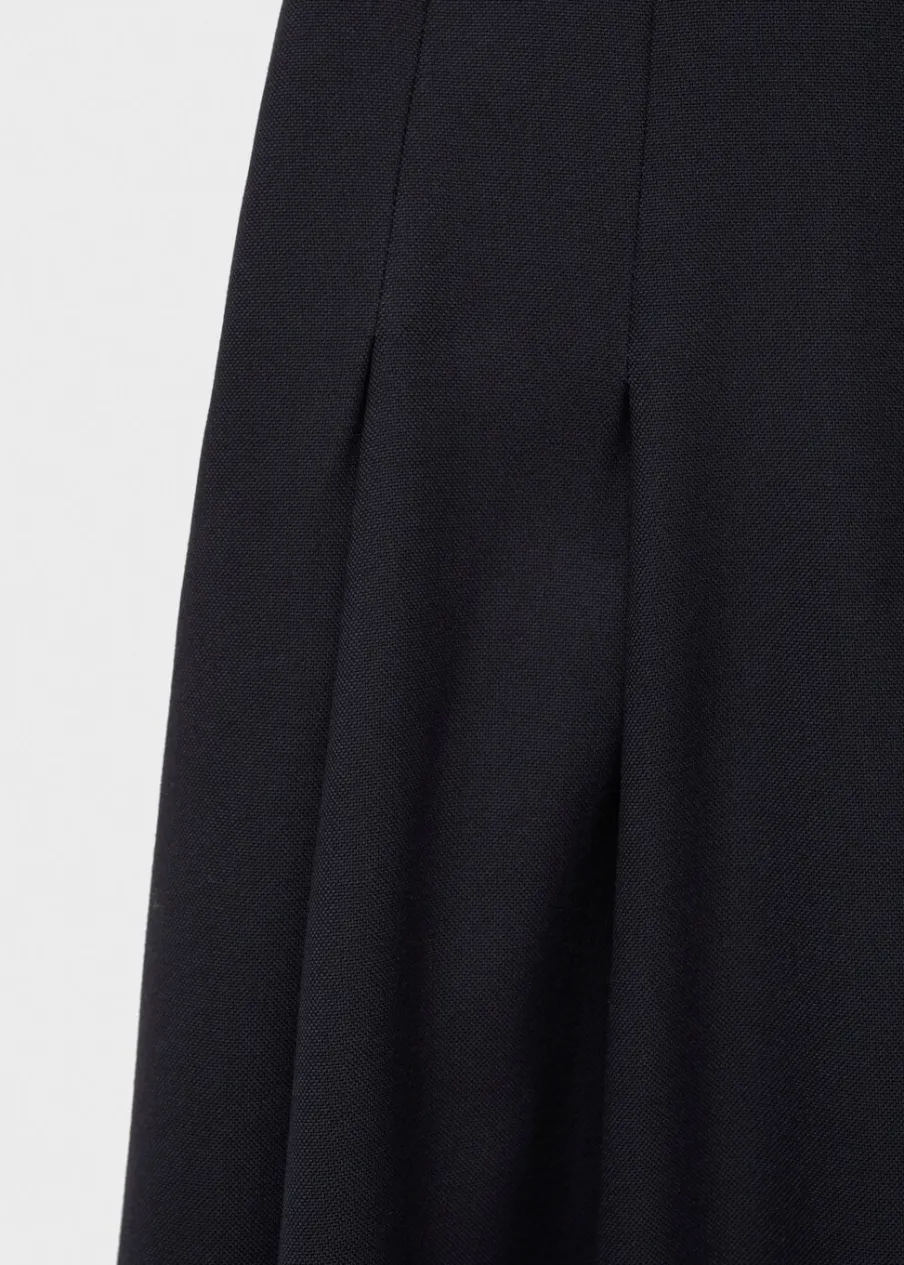Lejąca tkanina. Model długi. Model evasé. Dwie kieszenie boczne. Zapięcie na suwak i haftkę. Detal z zakładkami. Total look. Modelka ma 178 cm wzrostu i nosi rozmiar S/36.