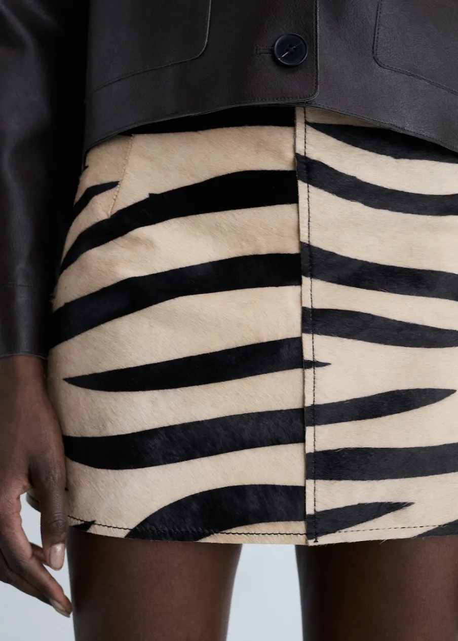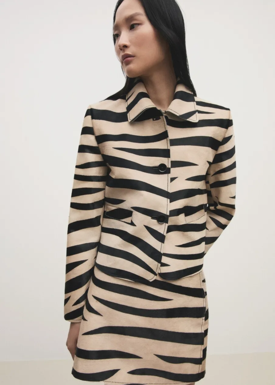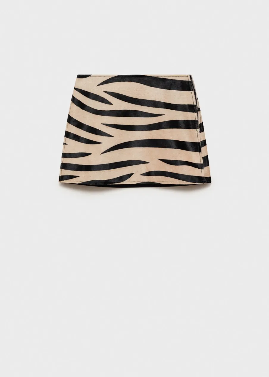100% skóra bydlęca. Krótki krój. Model prosty. Wzór w zebrę. Zwierzęcy wzór. Średni stan. Zapięcie na zamek z boku. Podszewka ze skóry. Total look.