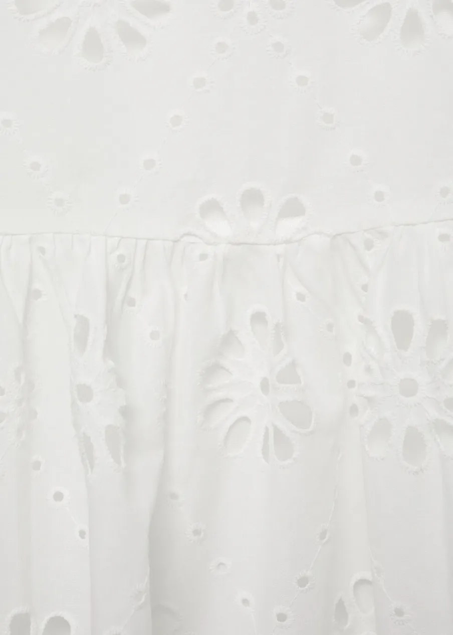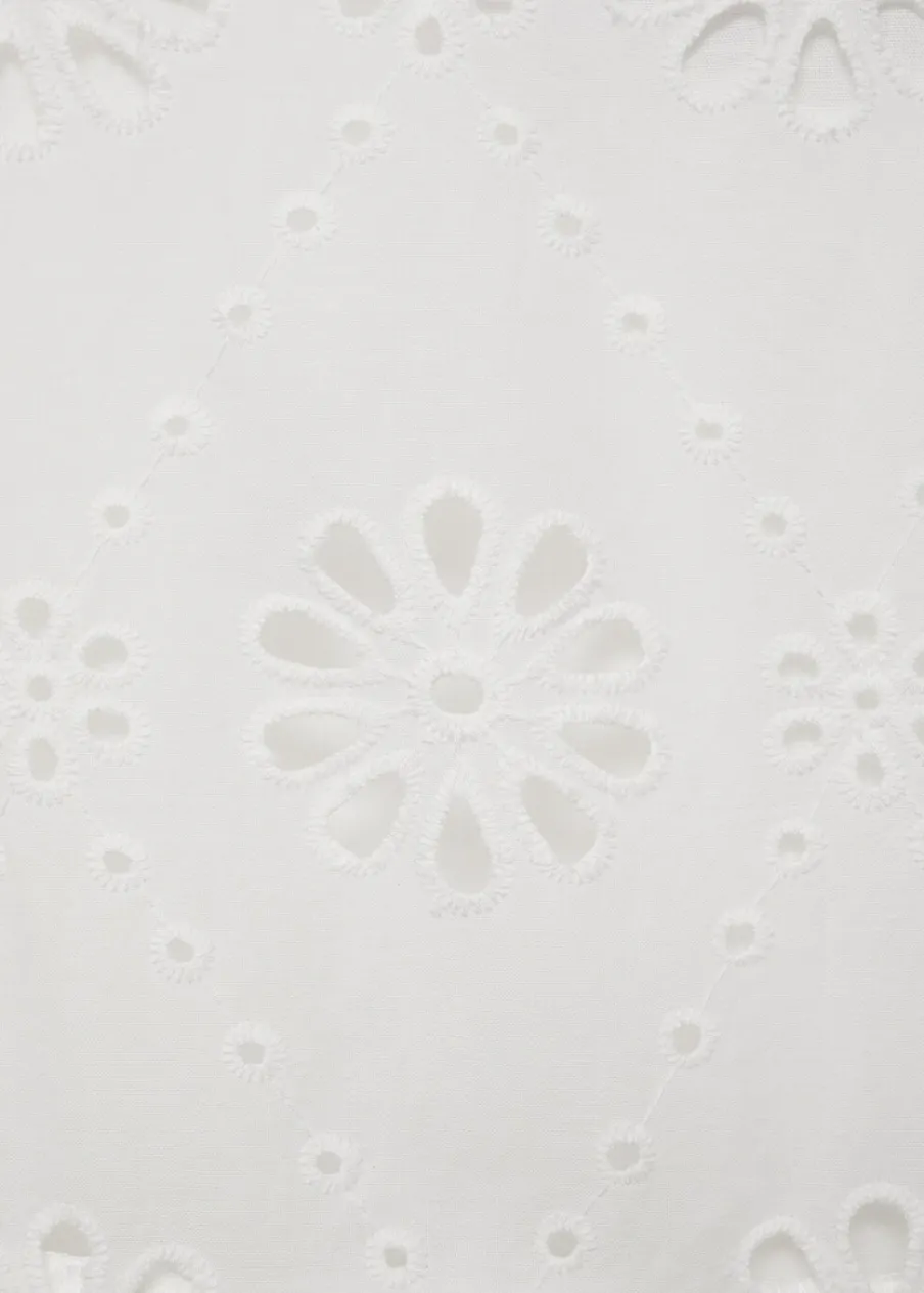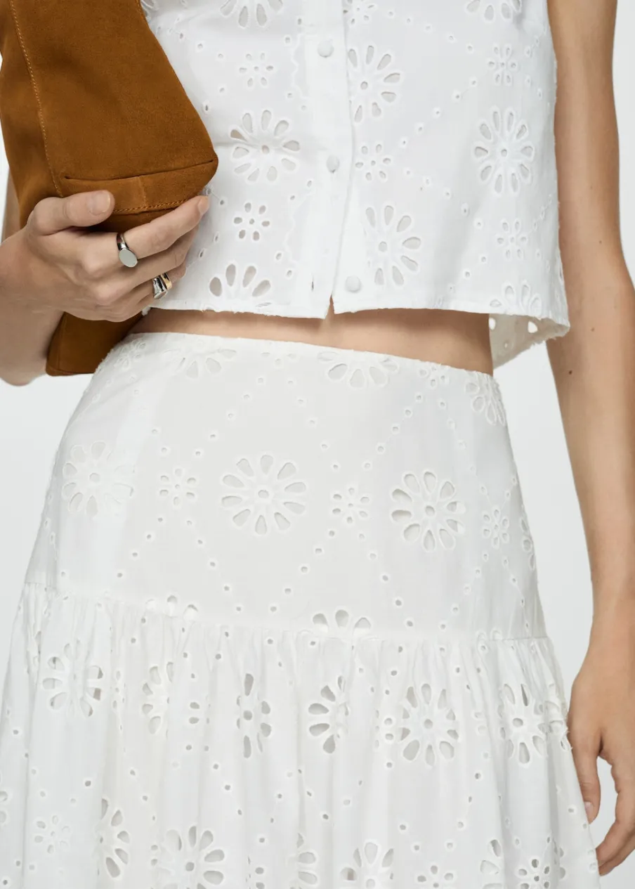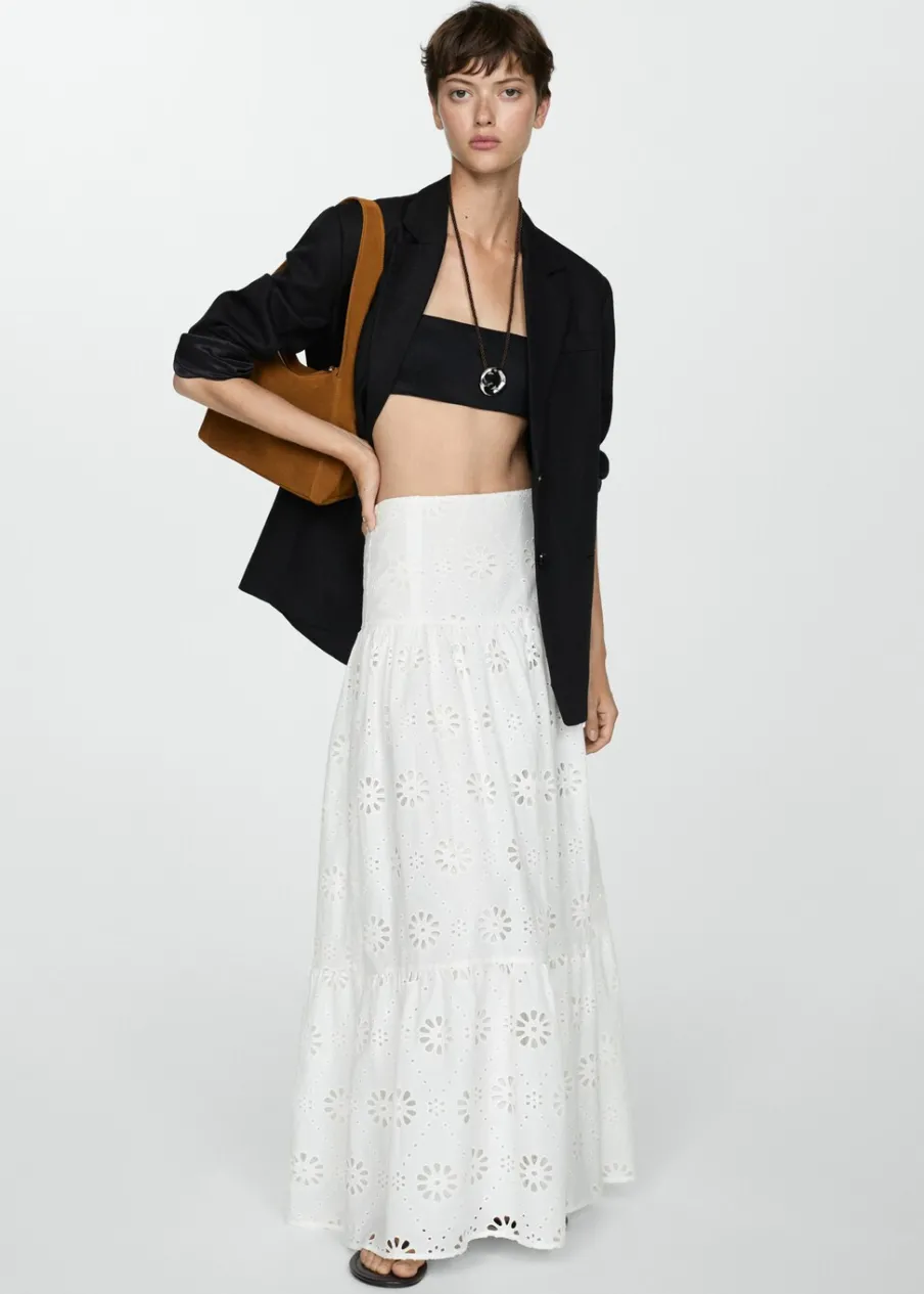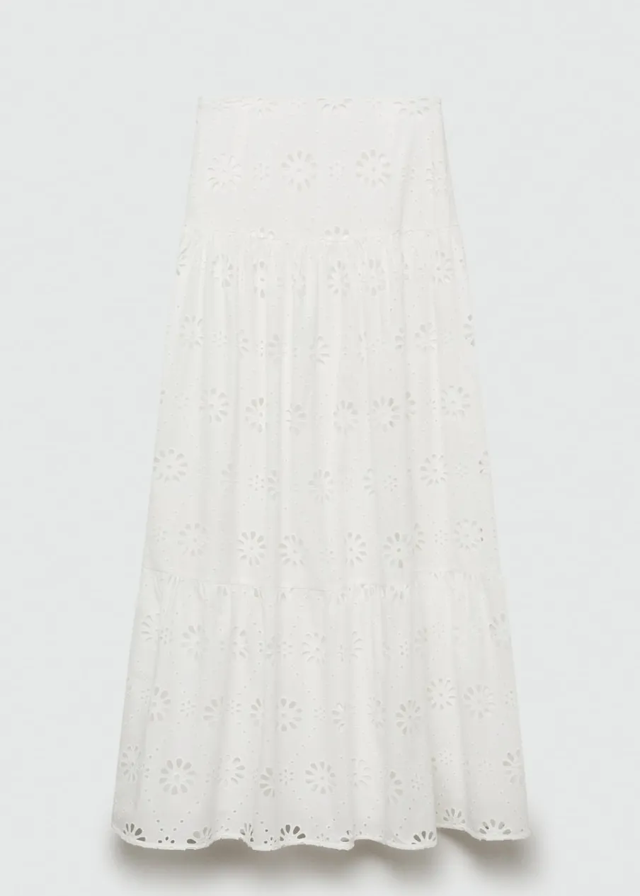 Model evasé. Model długi. Ażurowy model. Podwyższony stan. Boczne zapięcie na suwak. Falbana u dołu. Haftowany motyw. Tkanina z 100% bawełny.