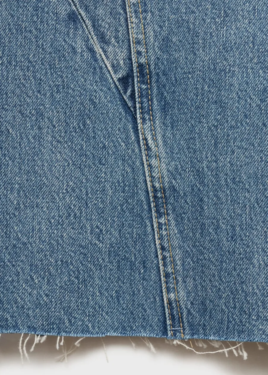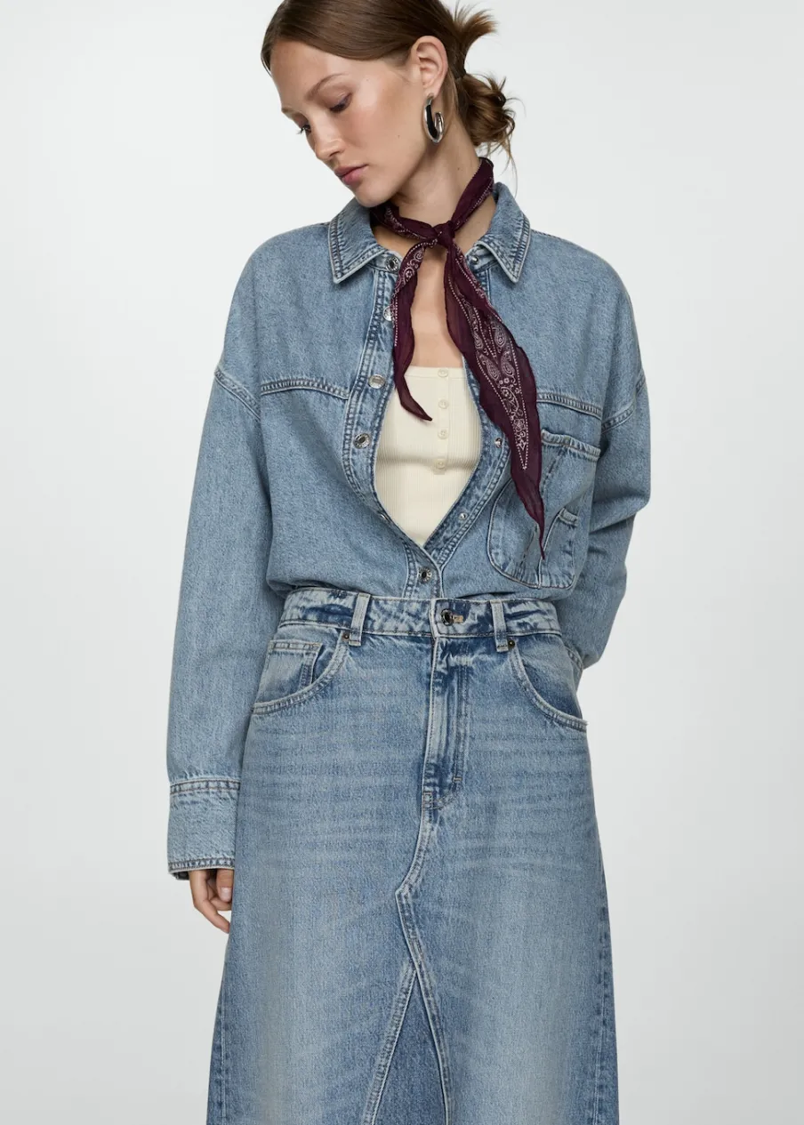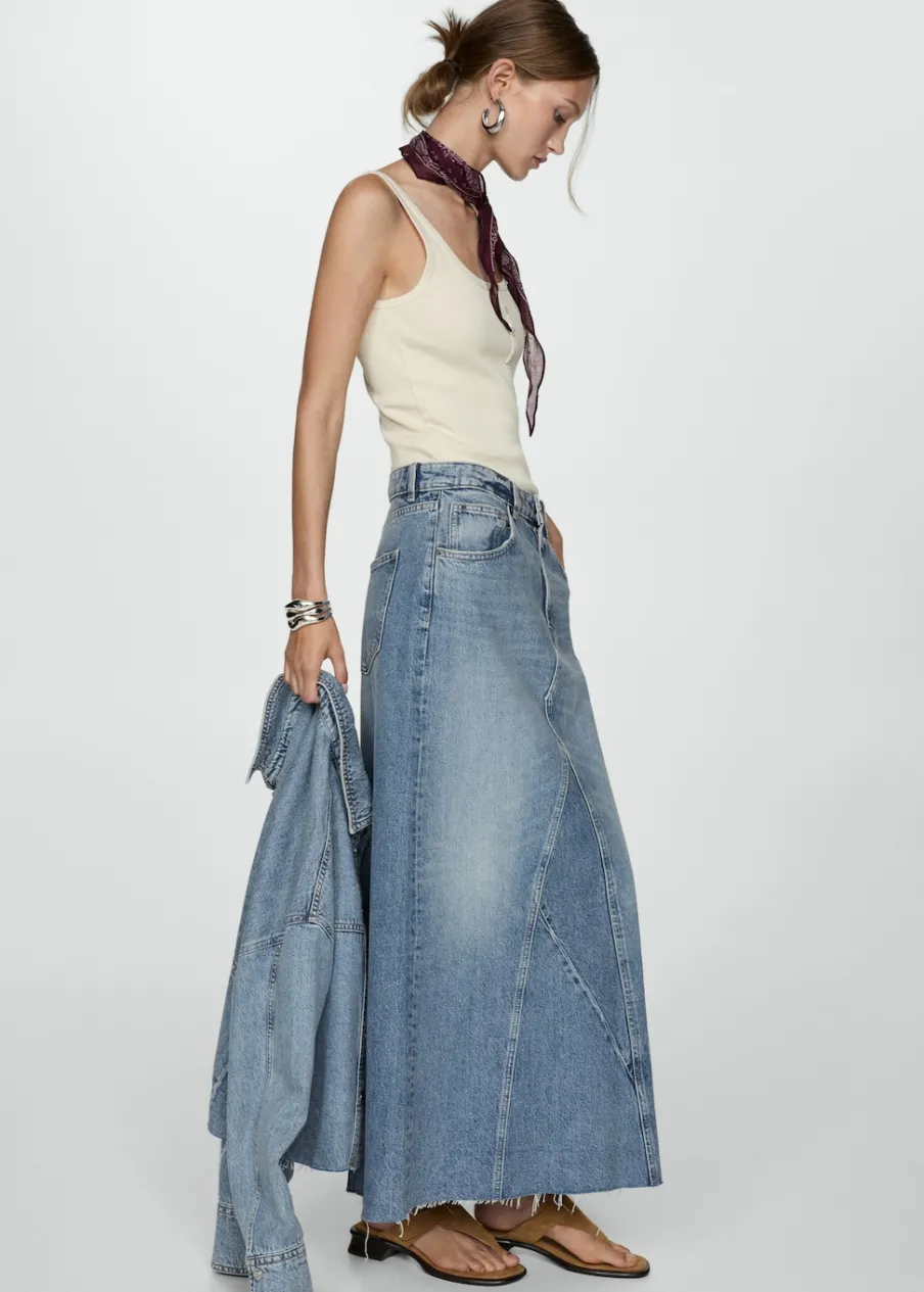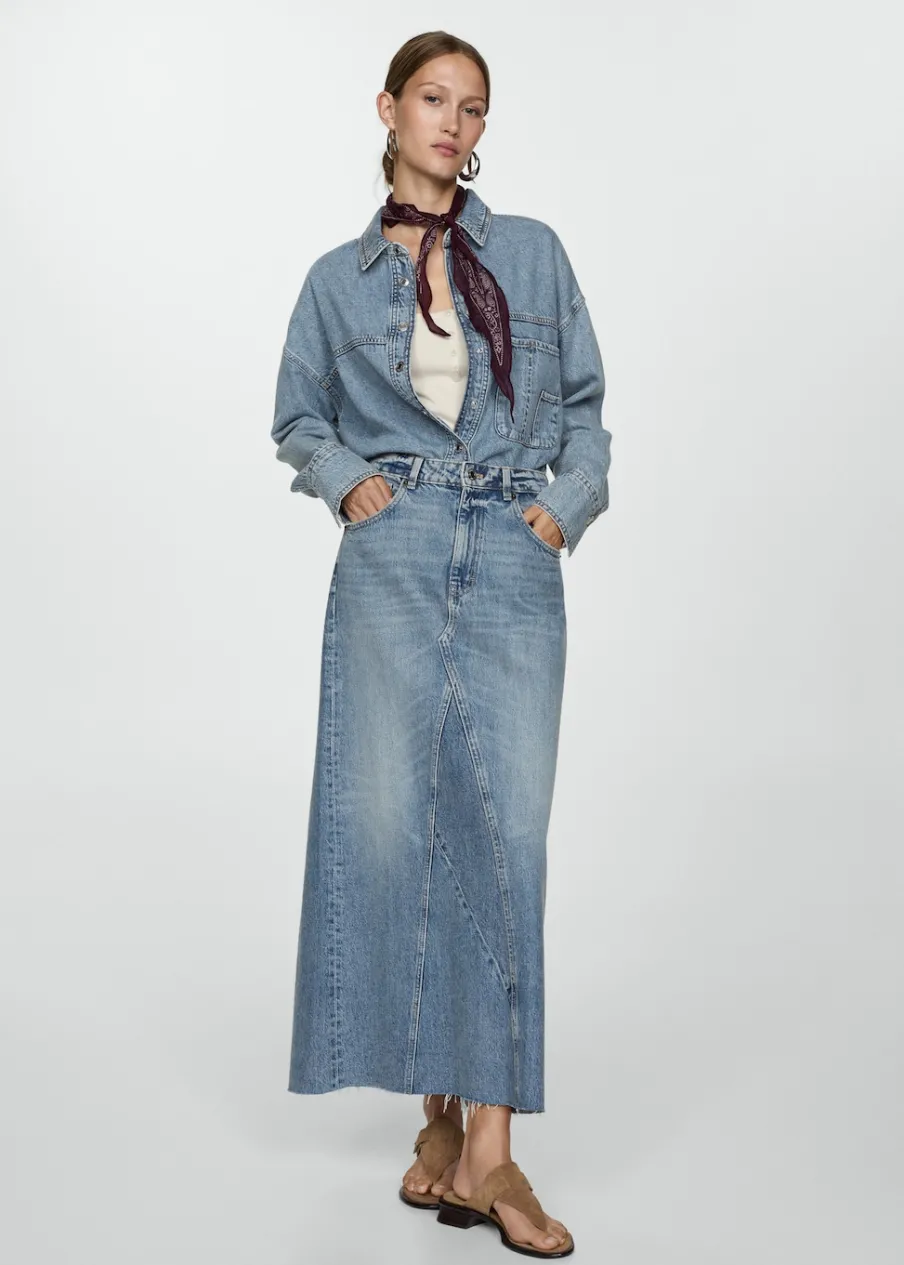 Tkanina bawełniana w dżinsowym stylu. Model prosty. Model długi. Średni stan. Szlufki. Pięć kieszeni. Ozdobne szwy. Detal z rozcięciem z tyłu. Zapięcie na suwak i guzik.