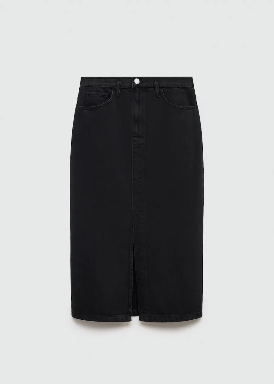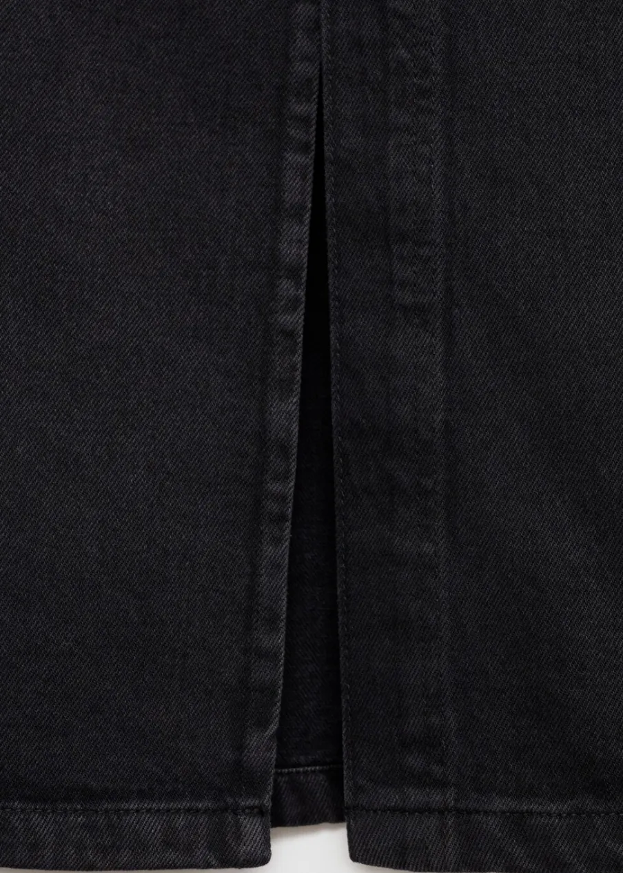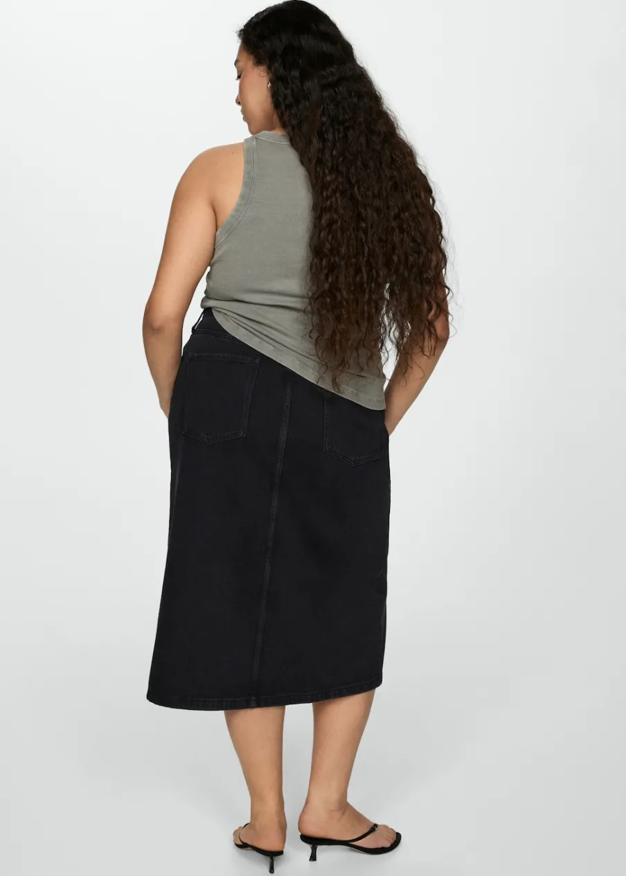 Tkanina bawełniana w dżinsowym stylu. Podwyższony stan. Model prosty. Krój do kolan. Dwie kieszenie z przodu. Kieszeń na bilon. Dwie kieszenie nakładane z tyłu. Szlufki. Rozcięcie u dołu. Dostępne w Plus Size. Zapięcie na zamek i guzik z przodu.
