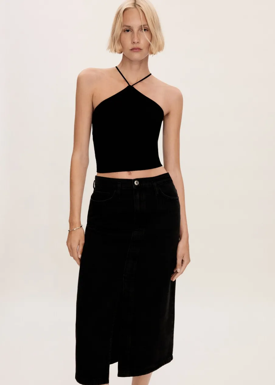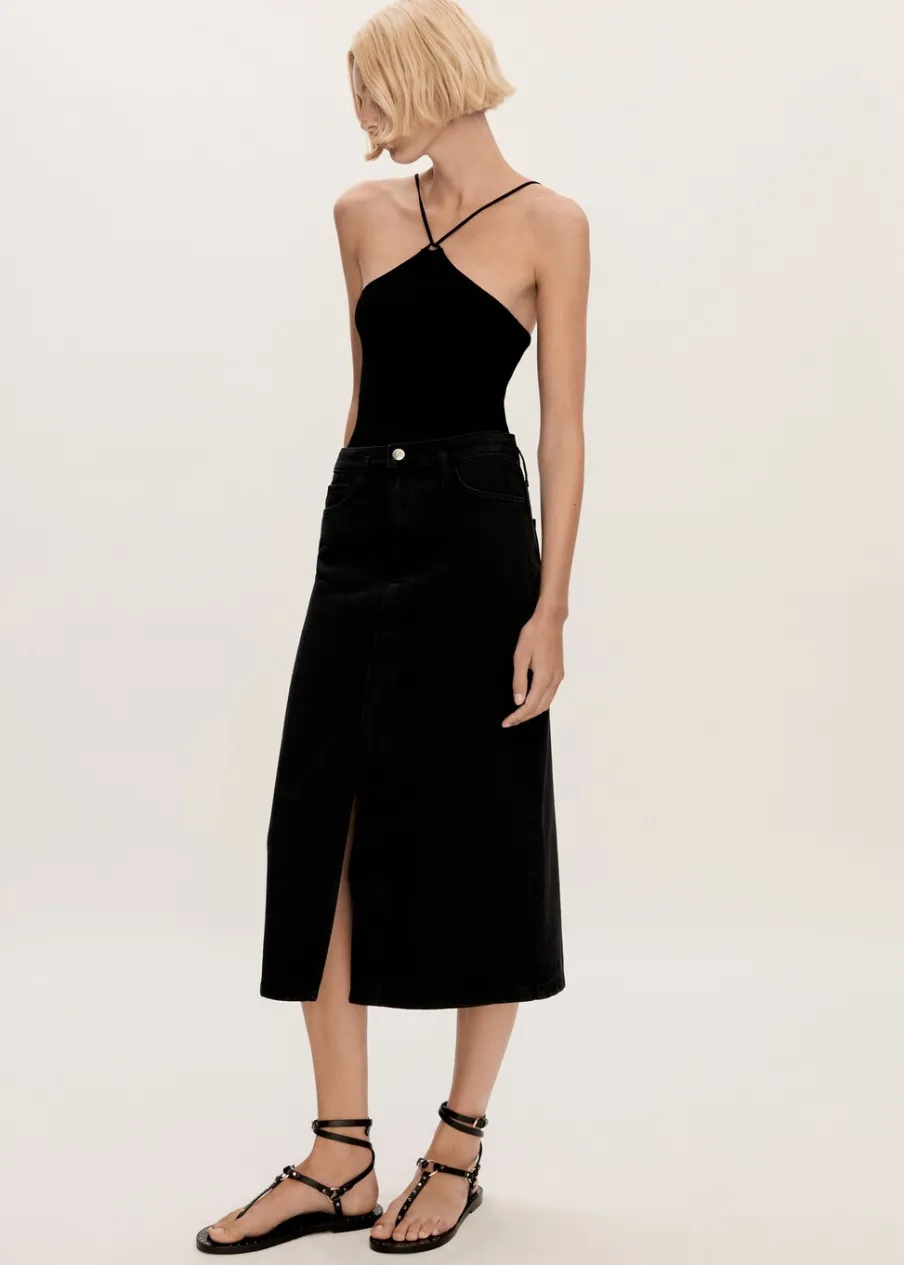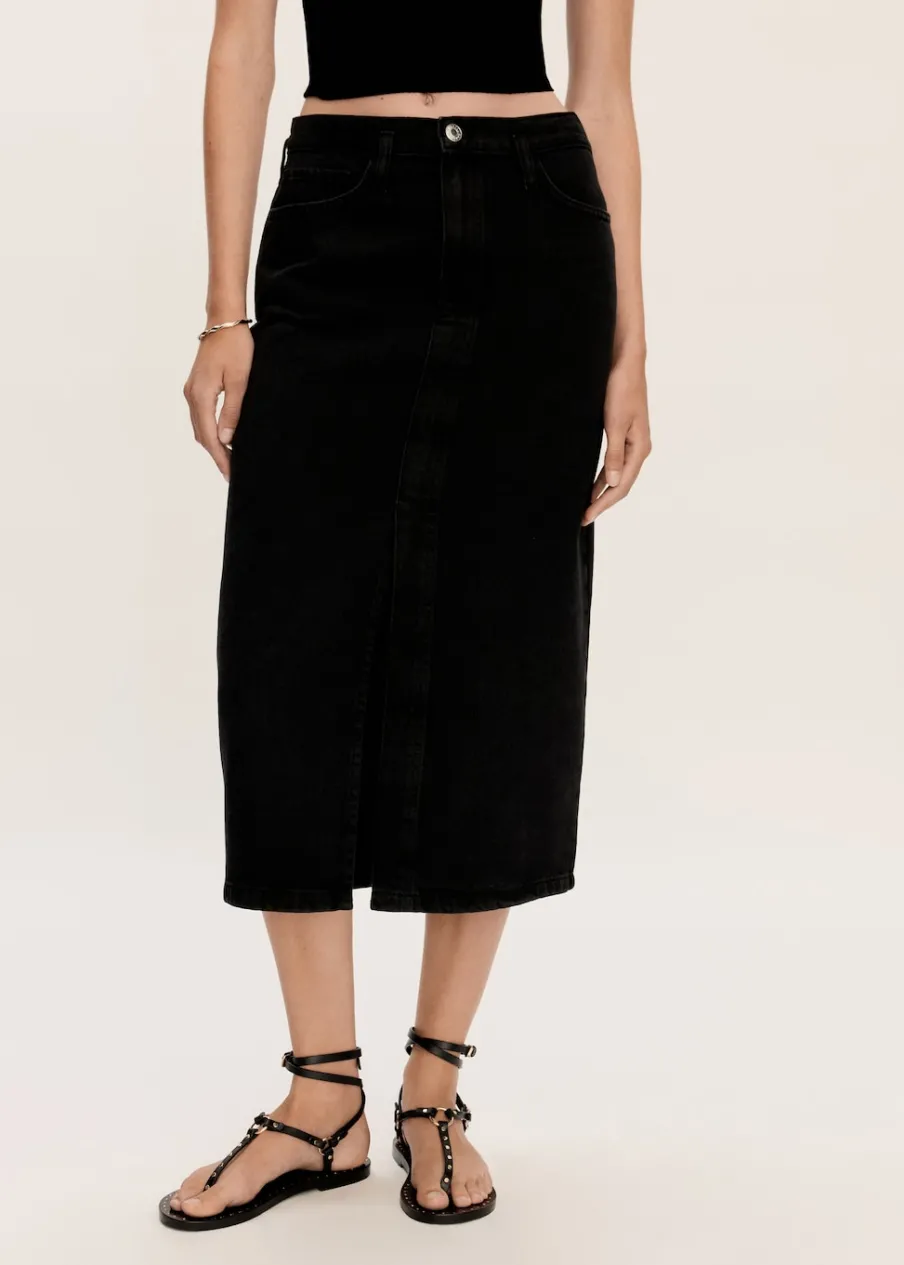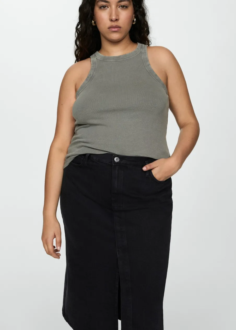 Tkanina bawełniana w dżinsowym stylu. Podwyższony stan. Model prosty. Krój do kolan. Dwie kieszenie z przodu. Kieszeń na bilon. Dwie kieszenie nakładane z tyłu. Szlufki. Rozcięcie u dołu. Dostępne w Plus Size. Zapięcie na zamek i guzik z przodu.