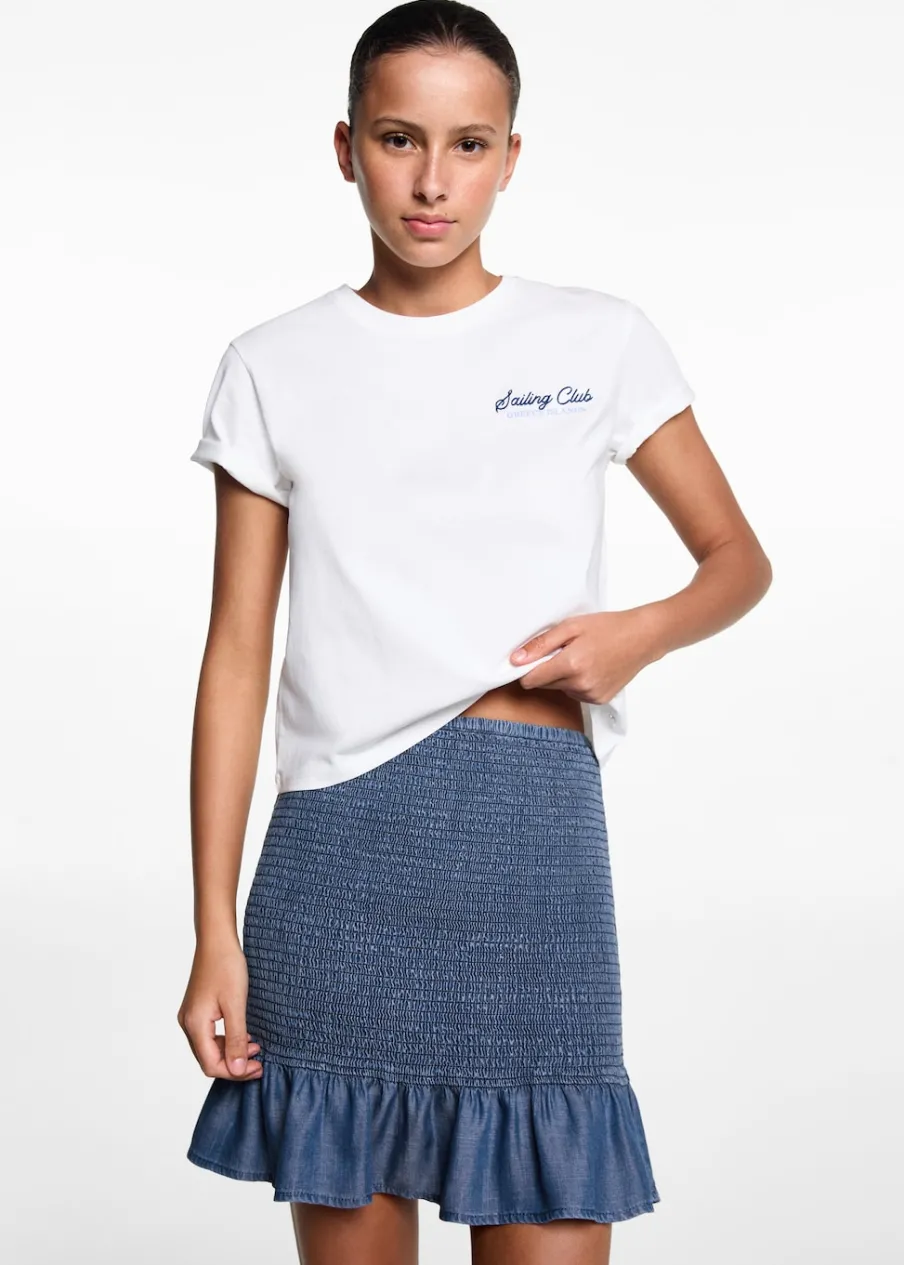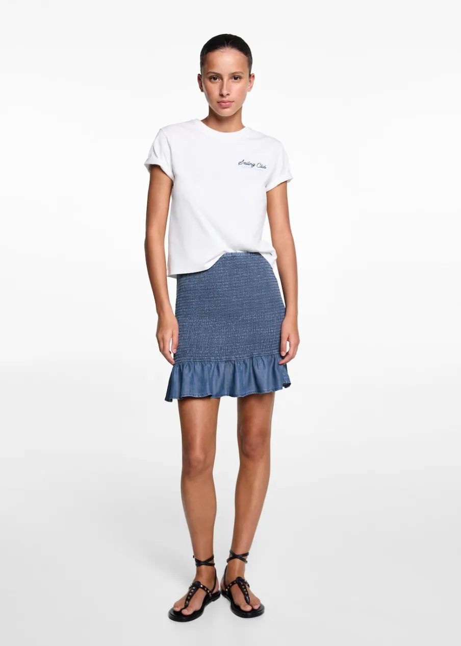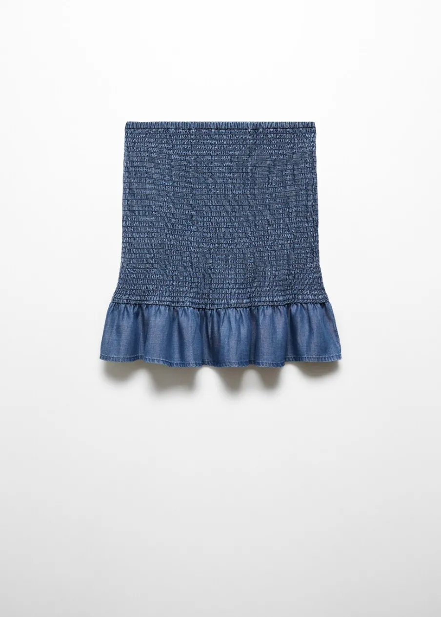 100% lyocell. Tkanina dżinsowa. Krótki krój. Model prosty. Marszczony detal. Falbanki u dołu. Elastyczny pas.