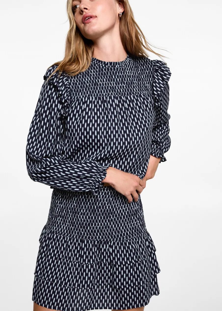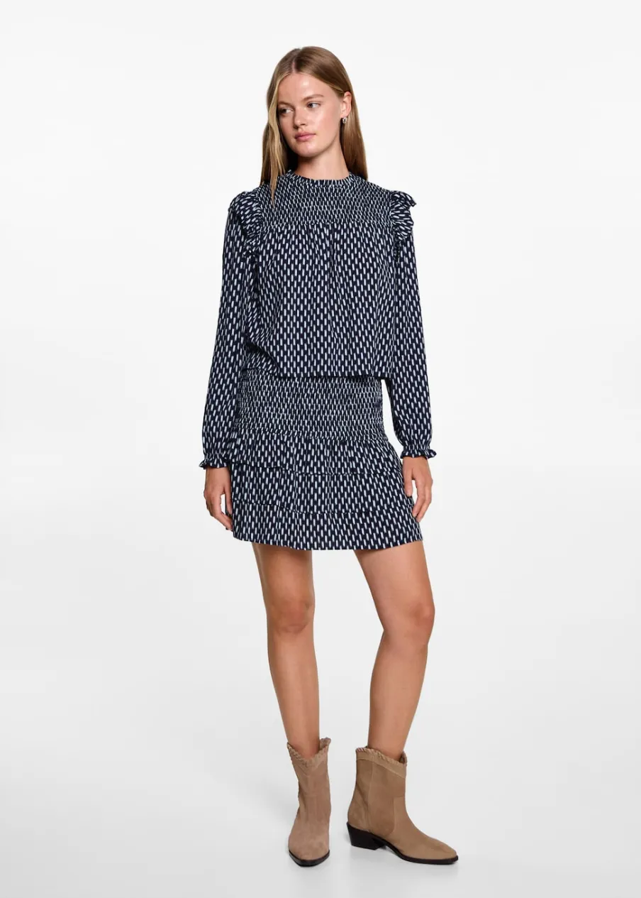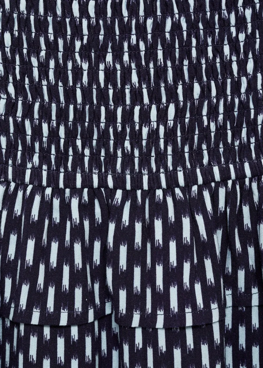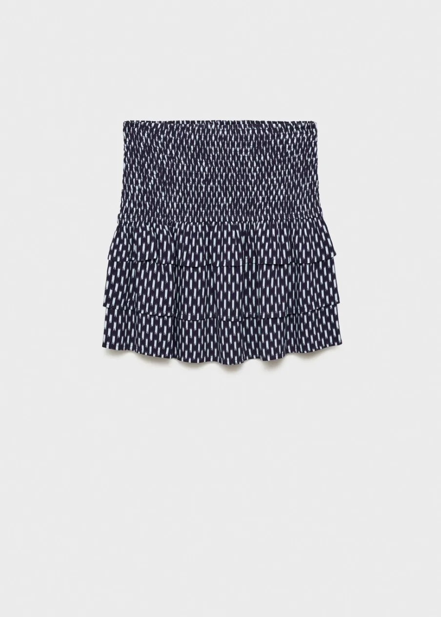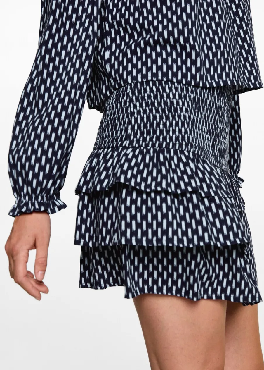 Krótki krój. Model prosty. Nadruk. Ozdobne marszczenie. Elastyczny pas. Model z falbankami. Bez zapięcia. Modelka ma 172 cm wzrostu i nosi rozmiar M. Dostępny zestaw total look.