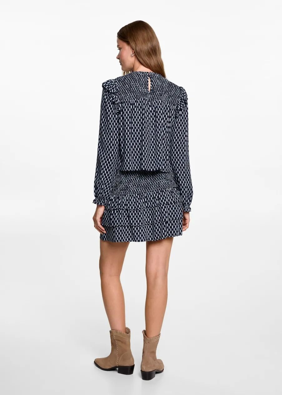 OpisKrótki krój. Model prosty. Nadruk. Ozdobne marszczenie. Elastyczny pas. Model z falbankami. Bez zapięcia. Modelka…