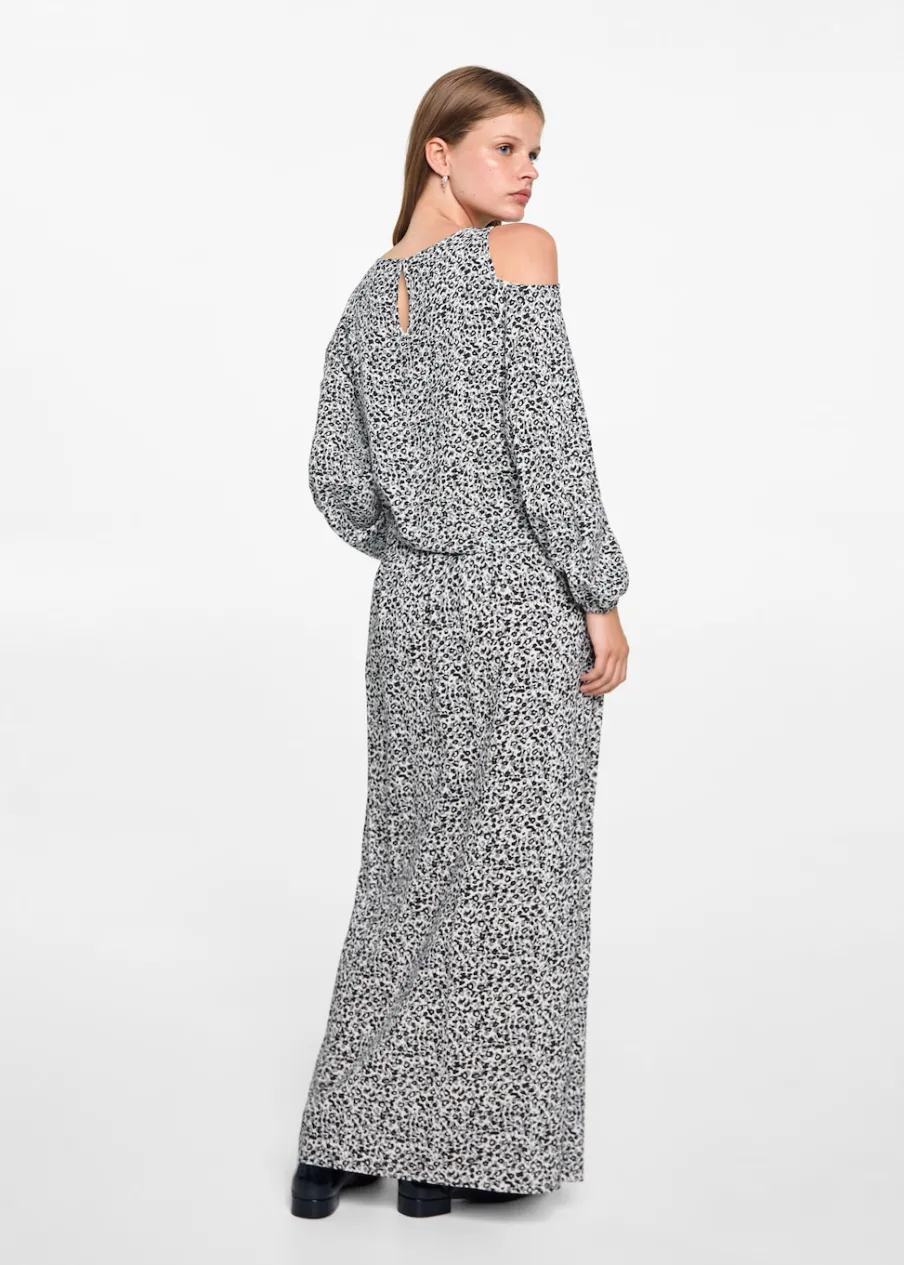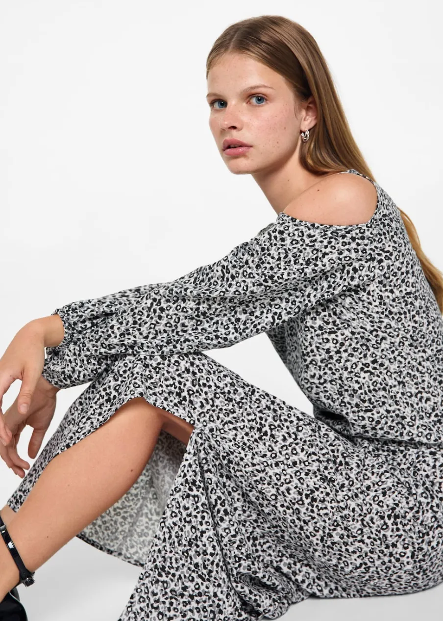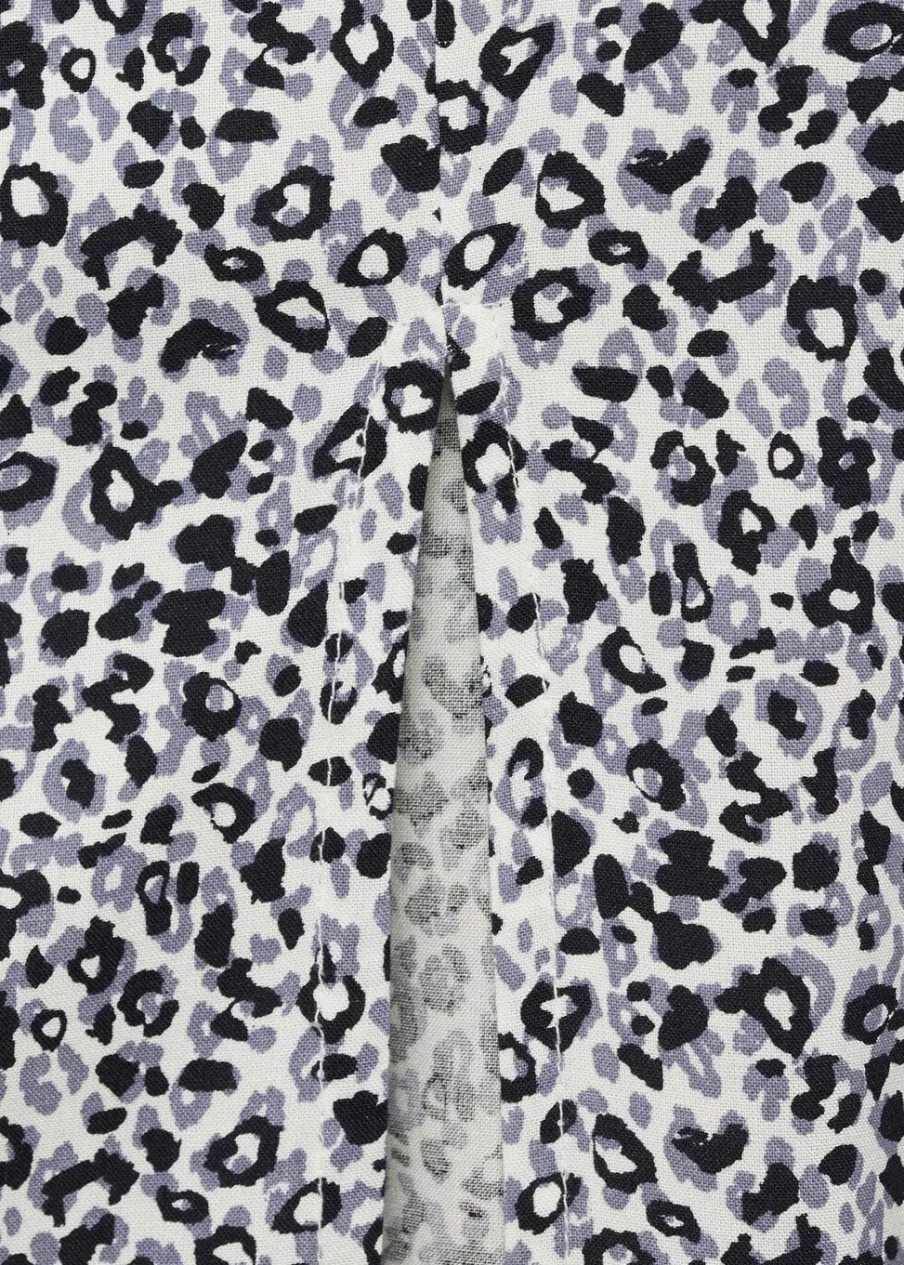 Model prosty. Wzór w lamparcie cętki. Elastyczny pas. Dół z rozcięciem po bokach. Krój do kolan. Tkanina z wiskozy.