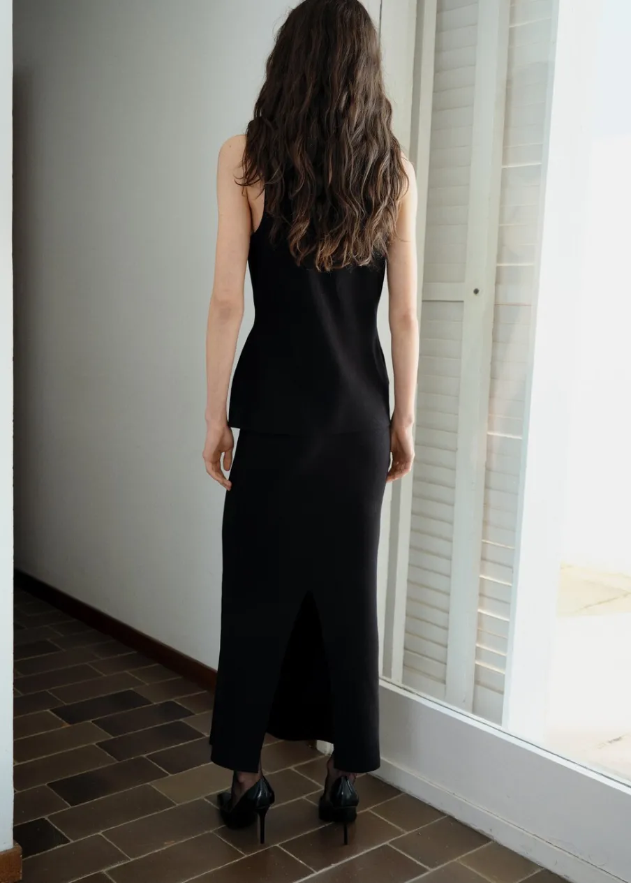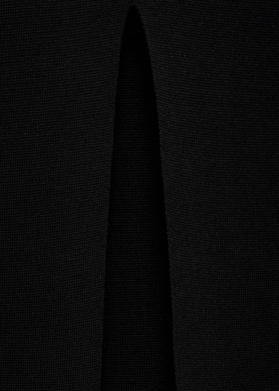 OpisTkanina z cienkiej dzianiny. Model ołówkowy. Krój do kolan. Podwyższony stan. Rozcięcie z tyłu u dołu. Bez za…