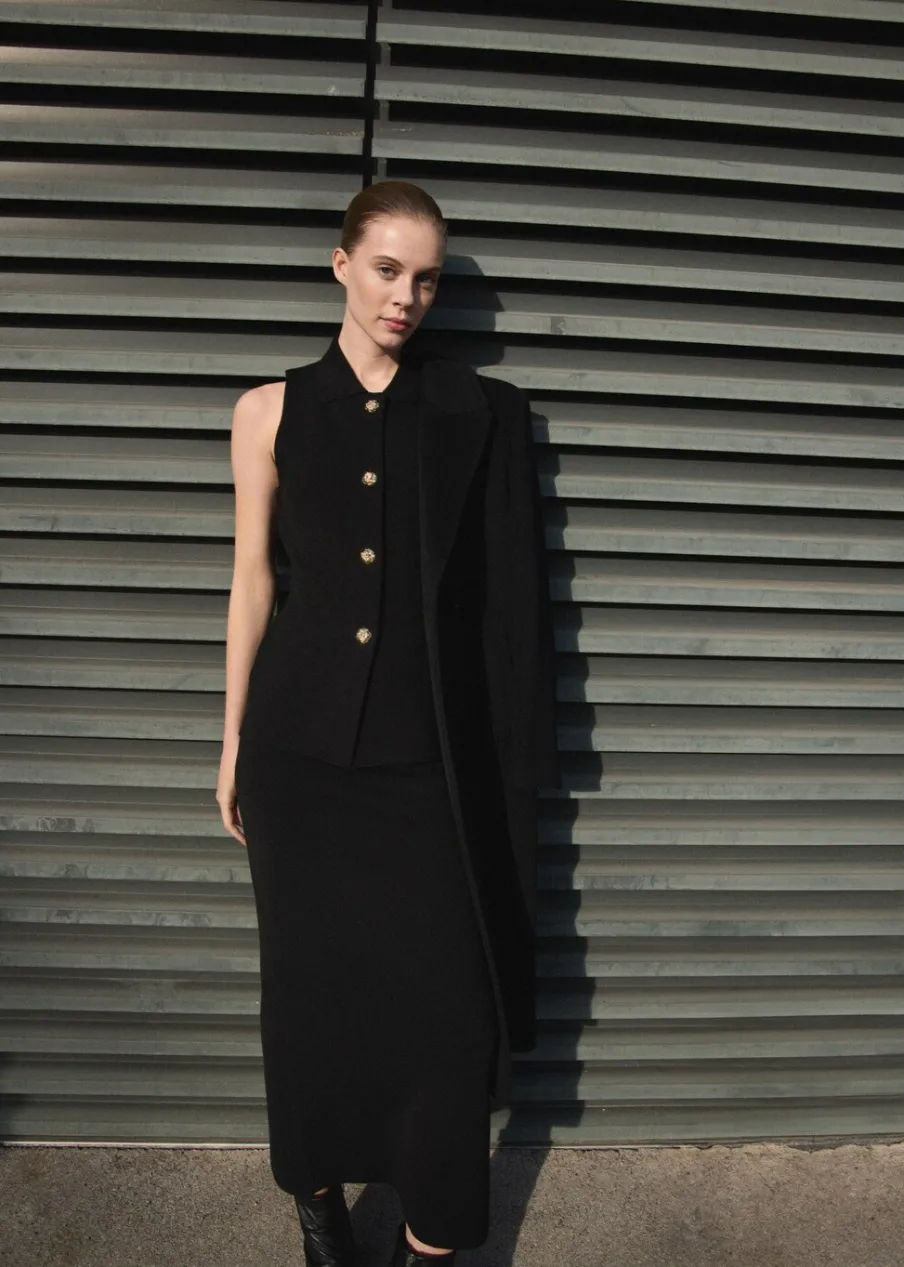 Tkanina z cienkiej dzianiny. Model ołówkowy. Krój do kolan. Podwyższony stan. Rozcięcie z tyłu u dołu. Bez zapięcia.