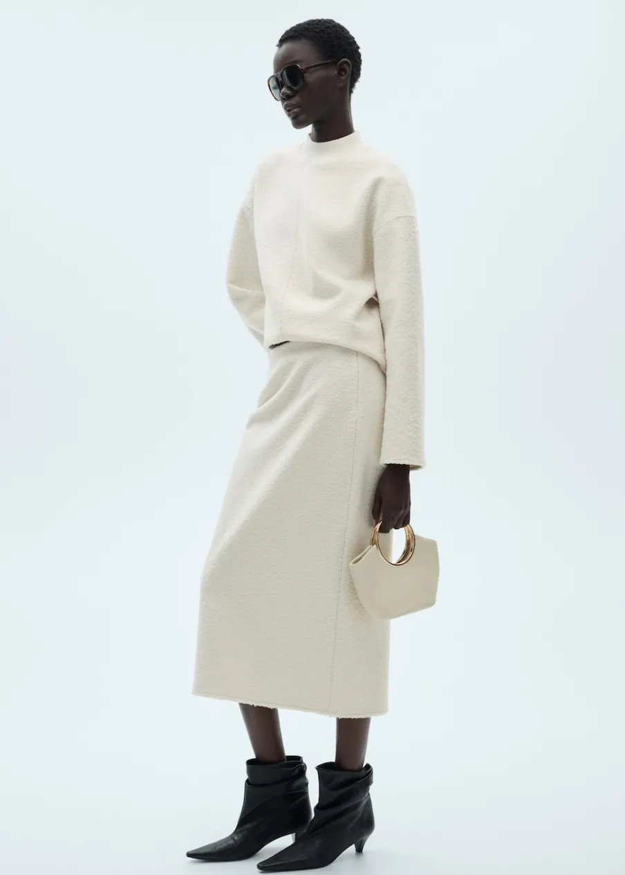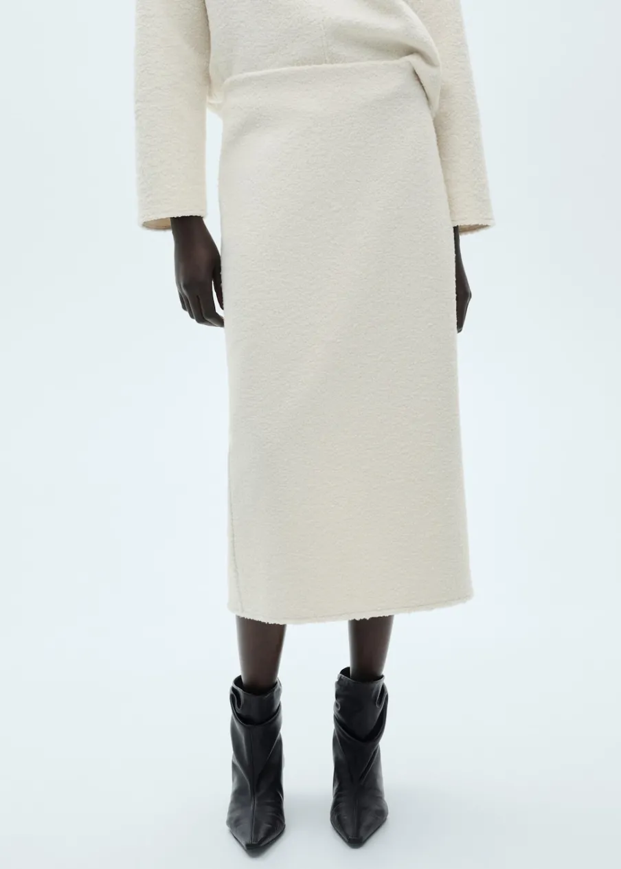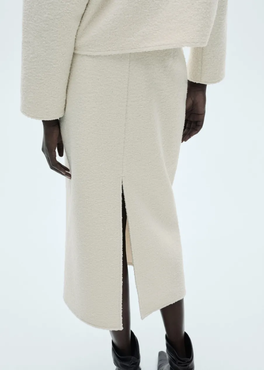 Tkanina bouclé. Krój do kolan. Model prosty. Średni stan. Elastyczna gumka. Zapięcie z boku. Detal z rozcięciem z tyłu. Total look.