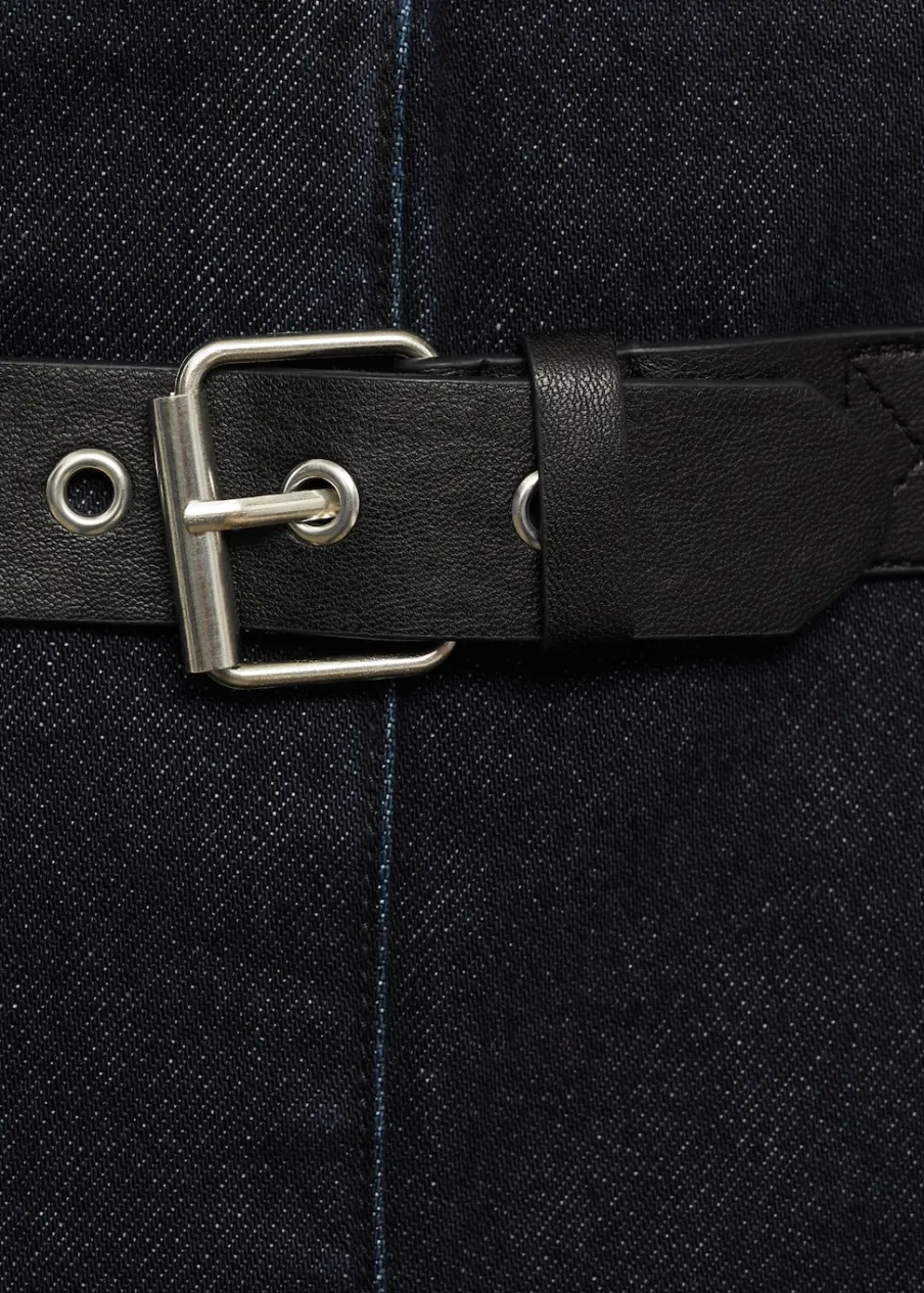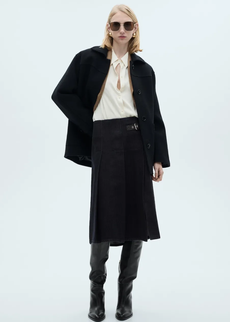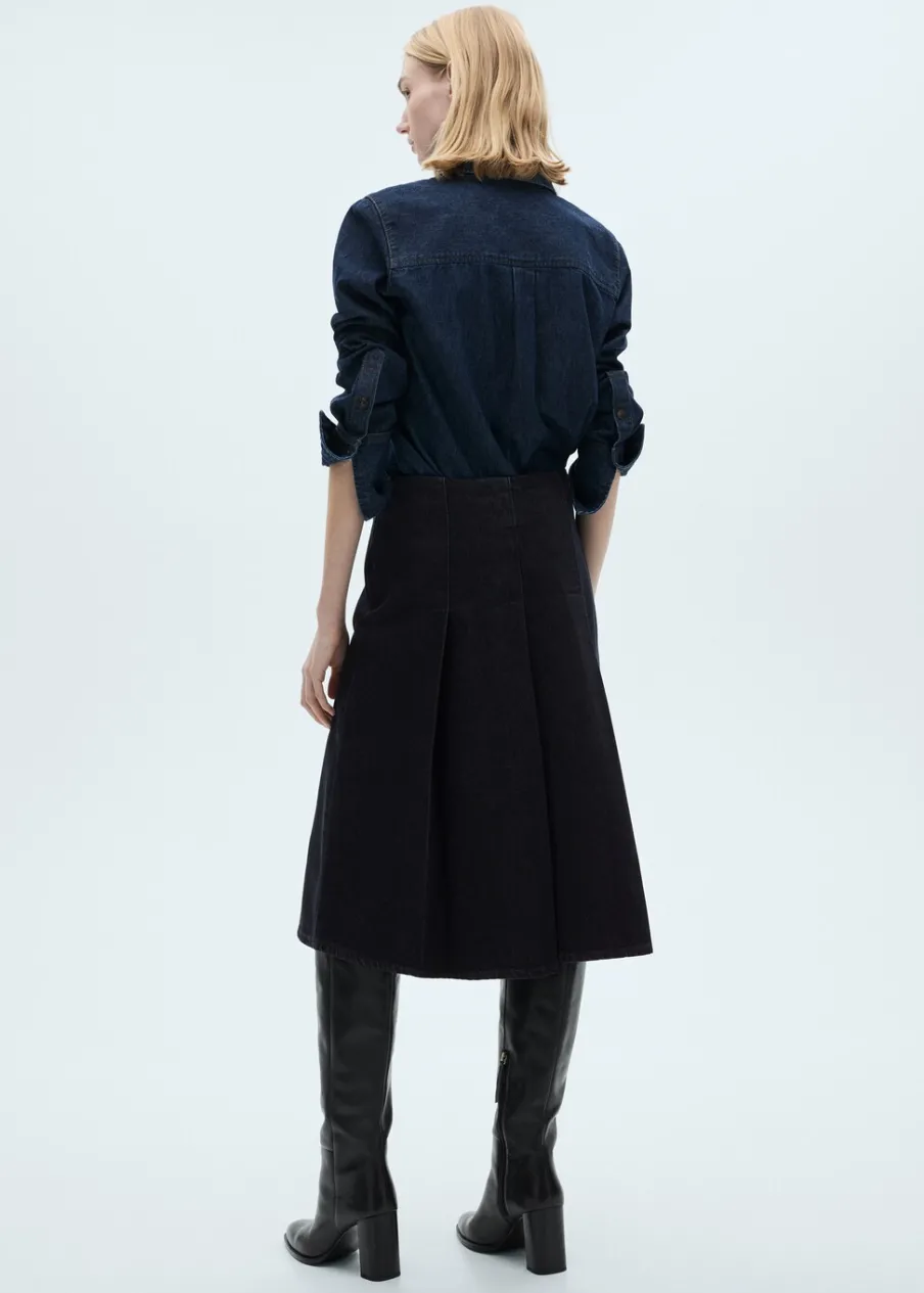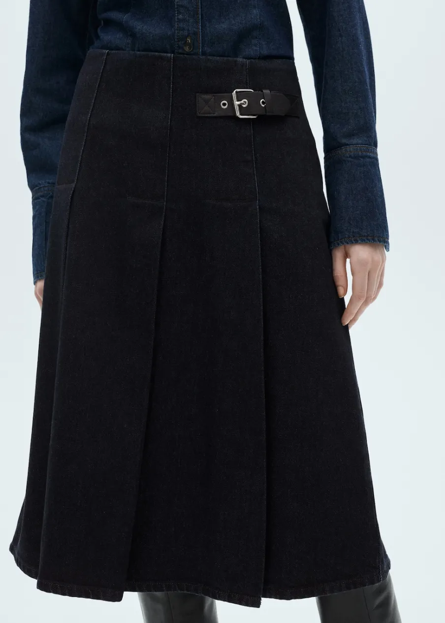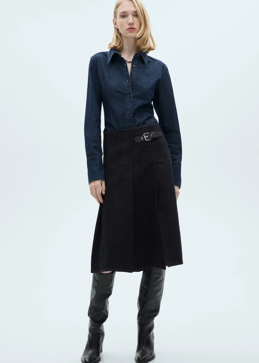 Tkanina bawełniana w dżinsowym stylu. Fason z zakładkami. Krój do kolan. Model evasé. Średni stan. Ozdobna klamra.