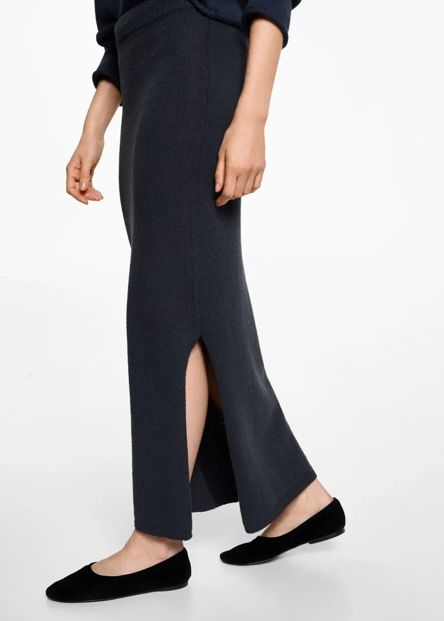 Bawełniana tkanina. Ściągaczowa dzianina. Model prosty. Rozcięcie boczne. Elastyczny pas.