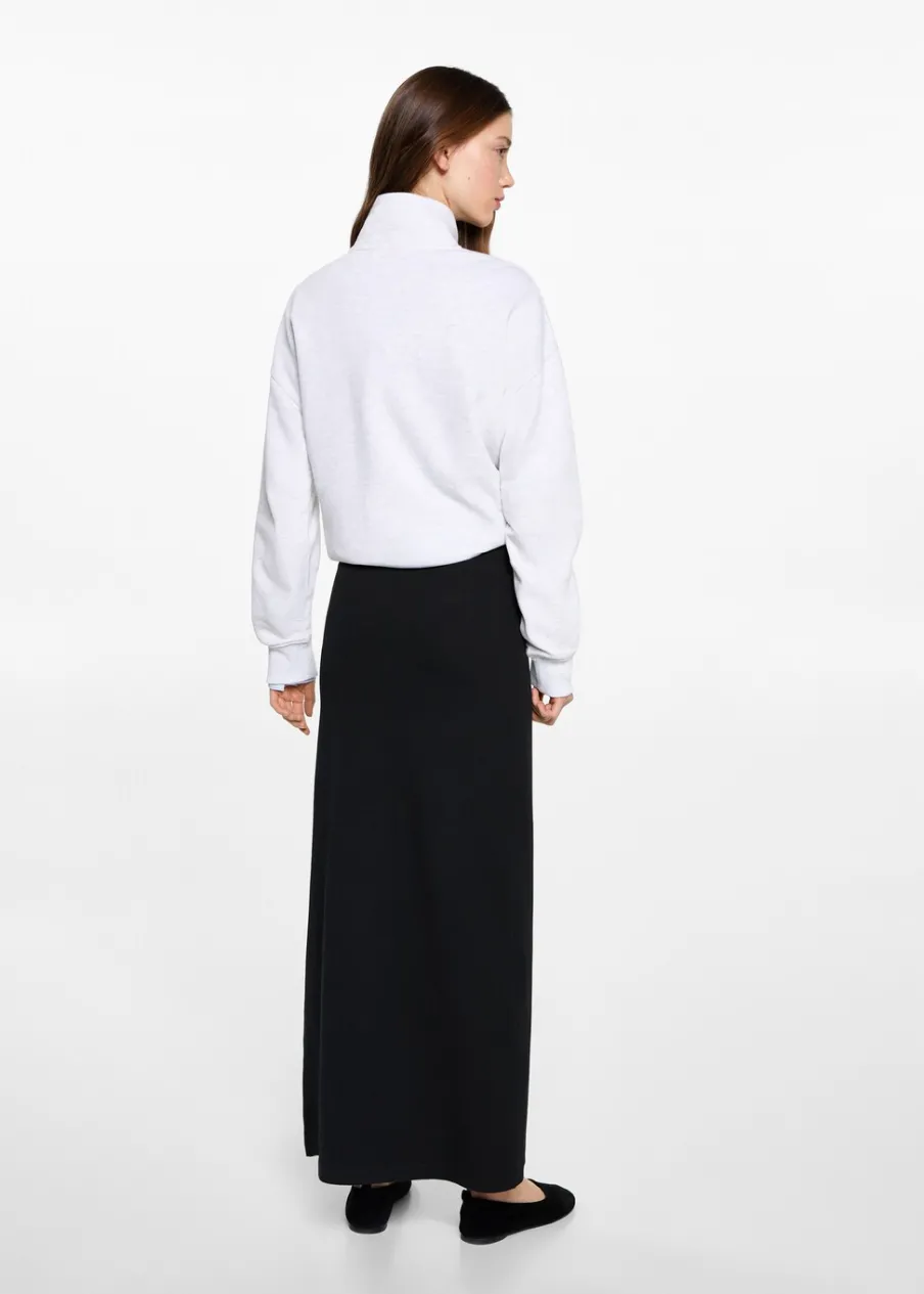 OpisTkanina bawełniana. Model prosty. Model długi. Krój do kolan. Podwyższony stan. Elastyczny pas. Bez zapięcia.
