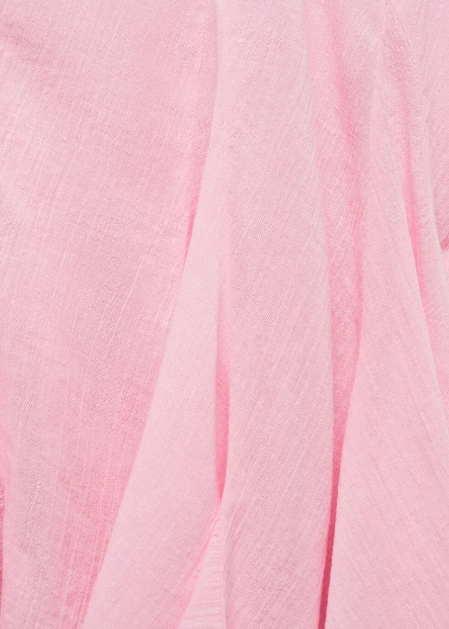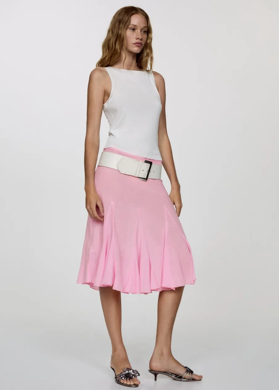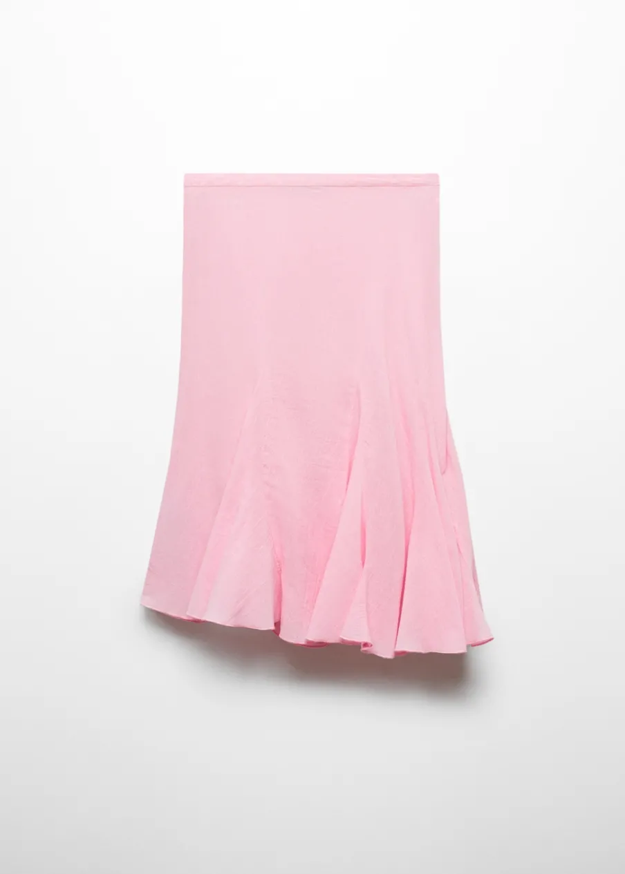 Średni stan. Model evasé. Krój do kolan. Asymetryczny dół. Boczne zapięcie na suwak. Z falbanami. Tkanina z 100% bawełny.