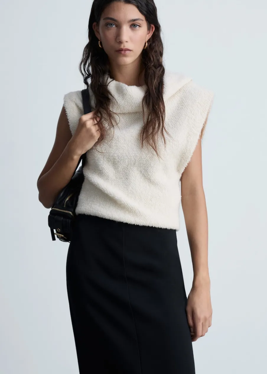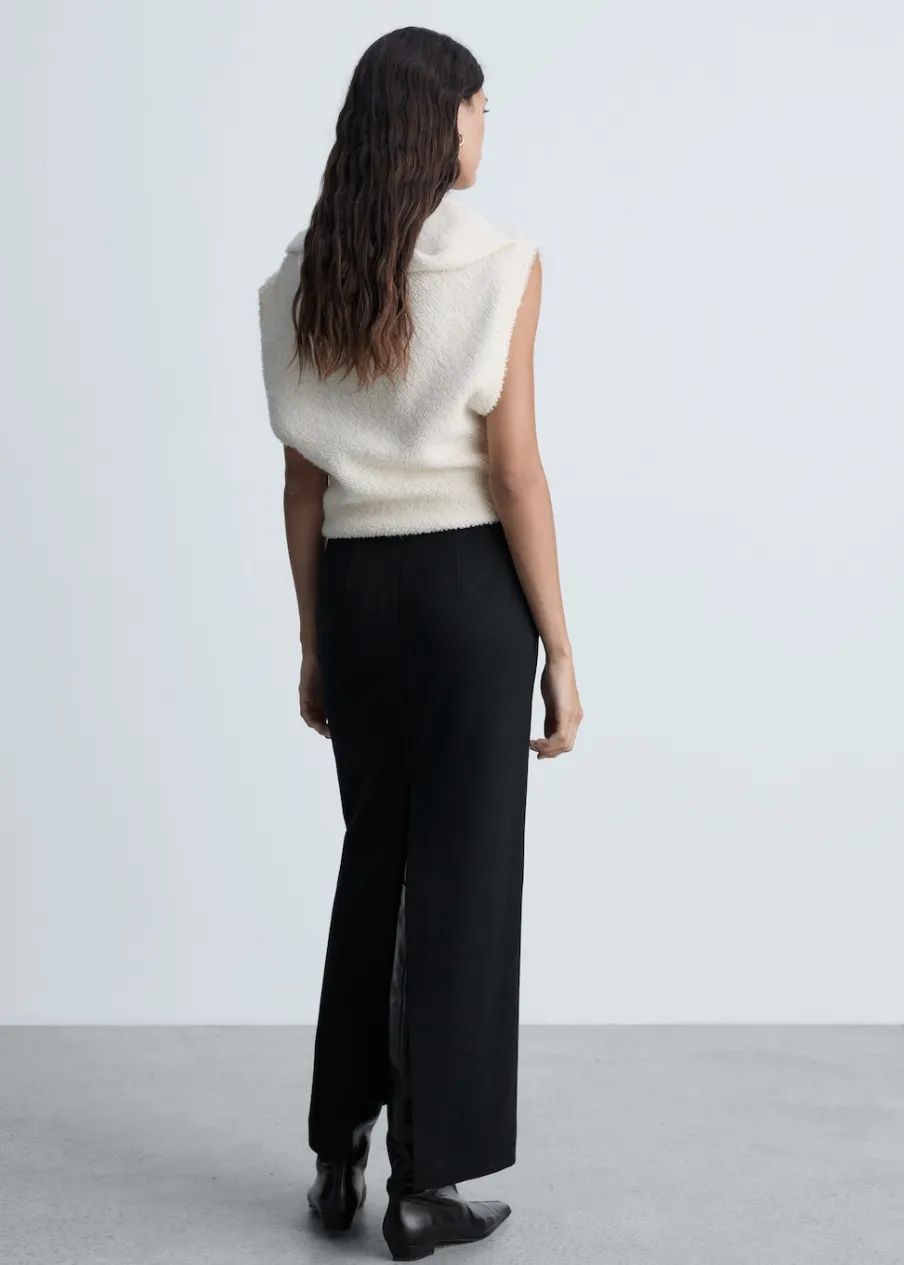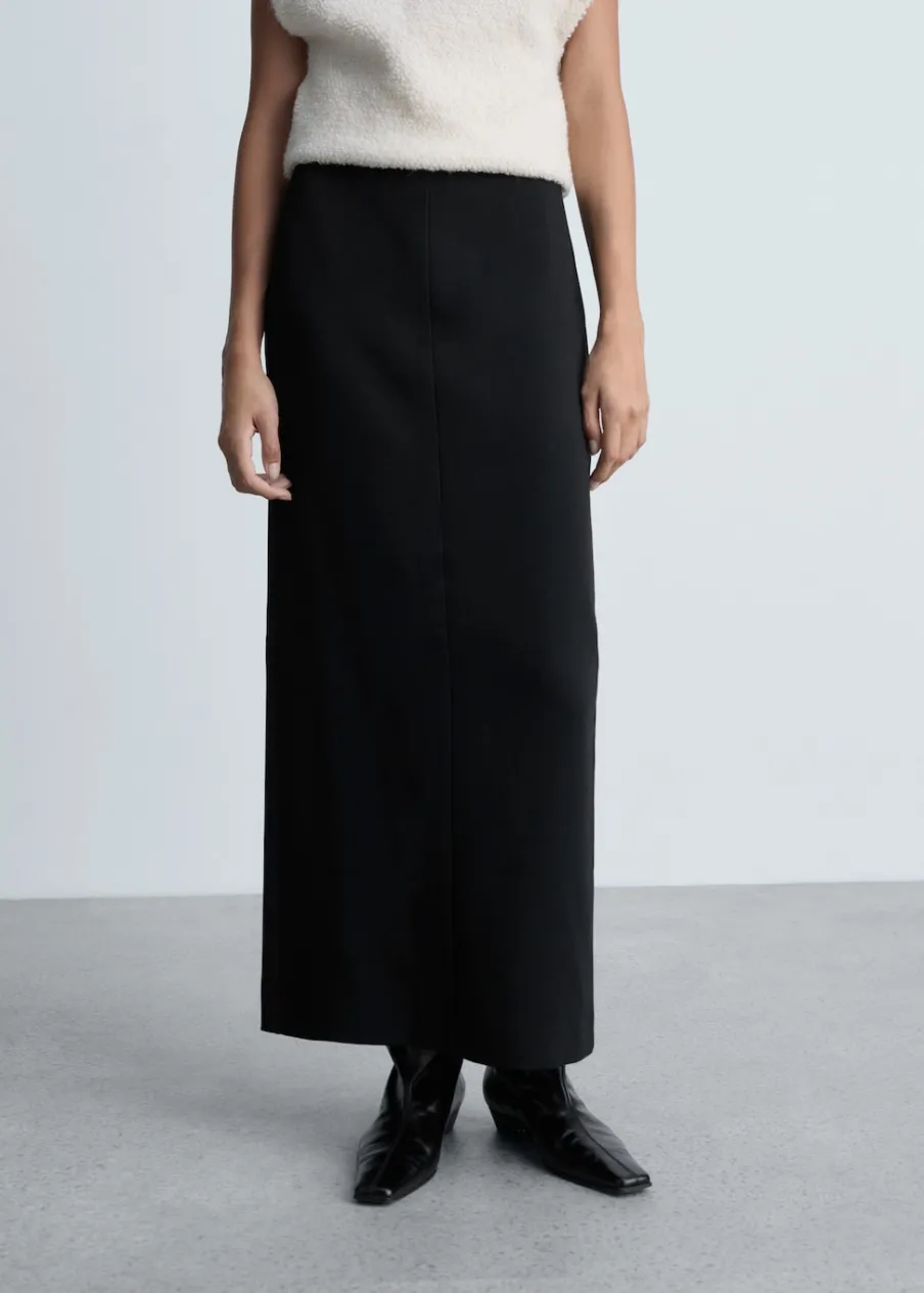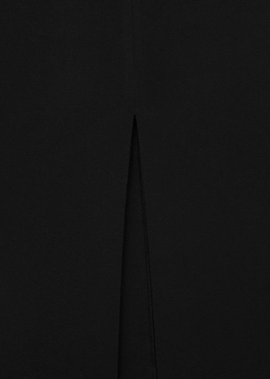 Model prosty. Model długi. Średni stan. Rozcięcie z przodu u dołu. Zapięcie z tyłu na suwak. Modelka ma 177 cm wzrostu i nosi rozmiar S/36.
