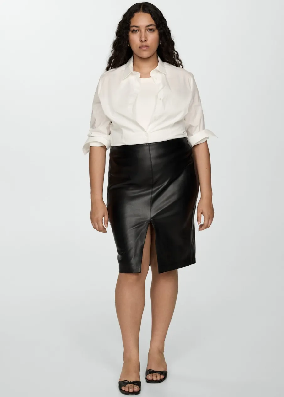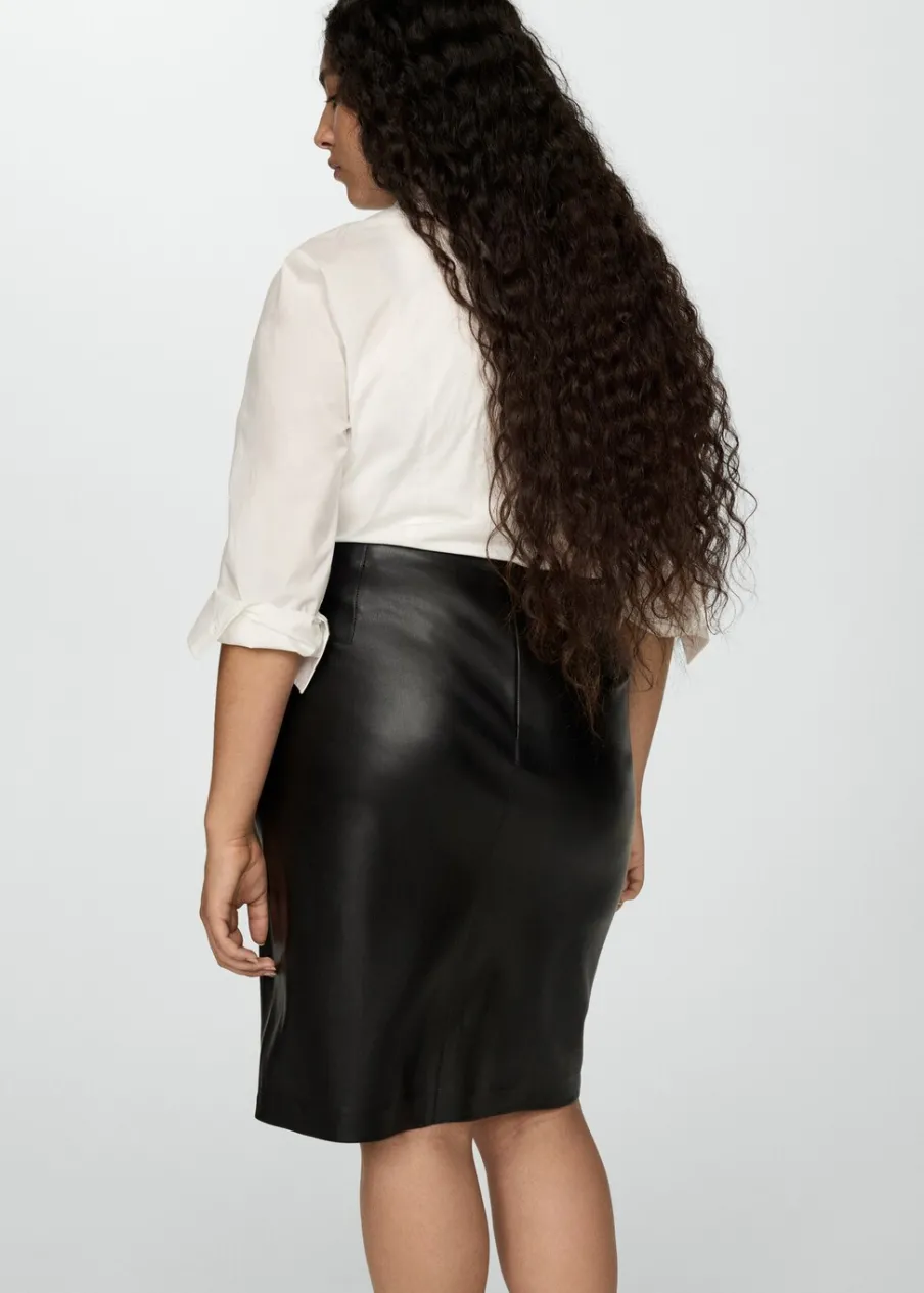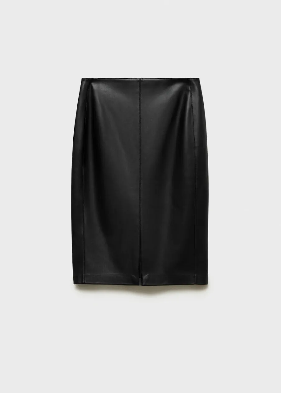 PU. Efekt skóry. Model ołówkowy. Krój do kolan. Model prosty. Zapięcie z tyłu na kryty suwak. Rozcięcie z tyłu. Stylizacje biurowe.