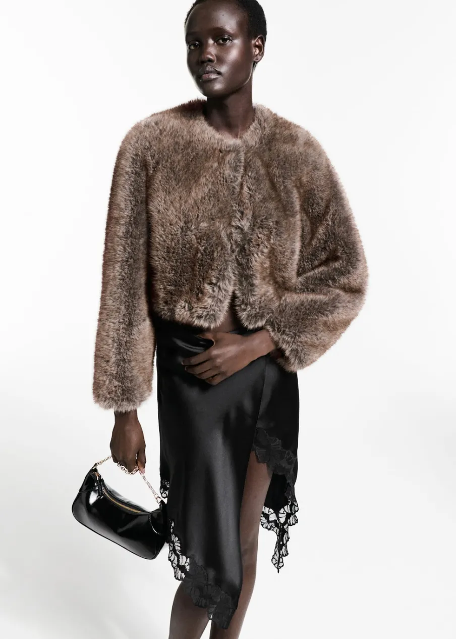 Satynowa tkanina. Lejąca tkanina. Asymetryczny krój. Model prosty. Krótki krój. Średni stan. Haftowana wstawka. Zapięcie na zamek z boku. Modelka ma 178 cm wzrostu i nosi rozmiar S/36. Kolekcja wizytowa.