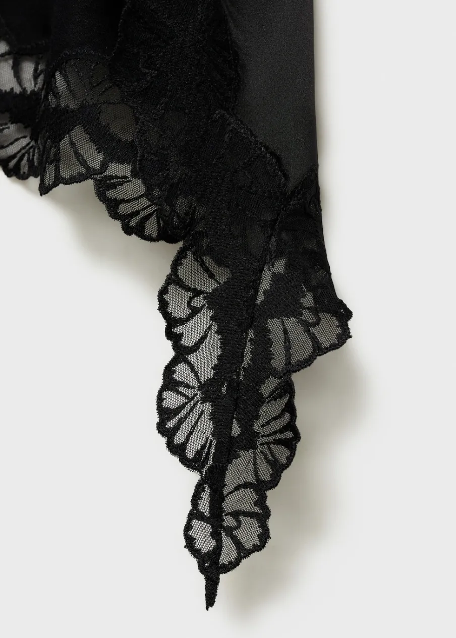 OpisSatynowa tkanina. Lejąca tkanina. Asymetryczny krój. Model prosty. Krótki krój. Średni stan. Haftowana wstawka….
