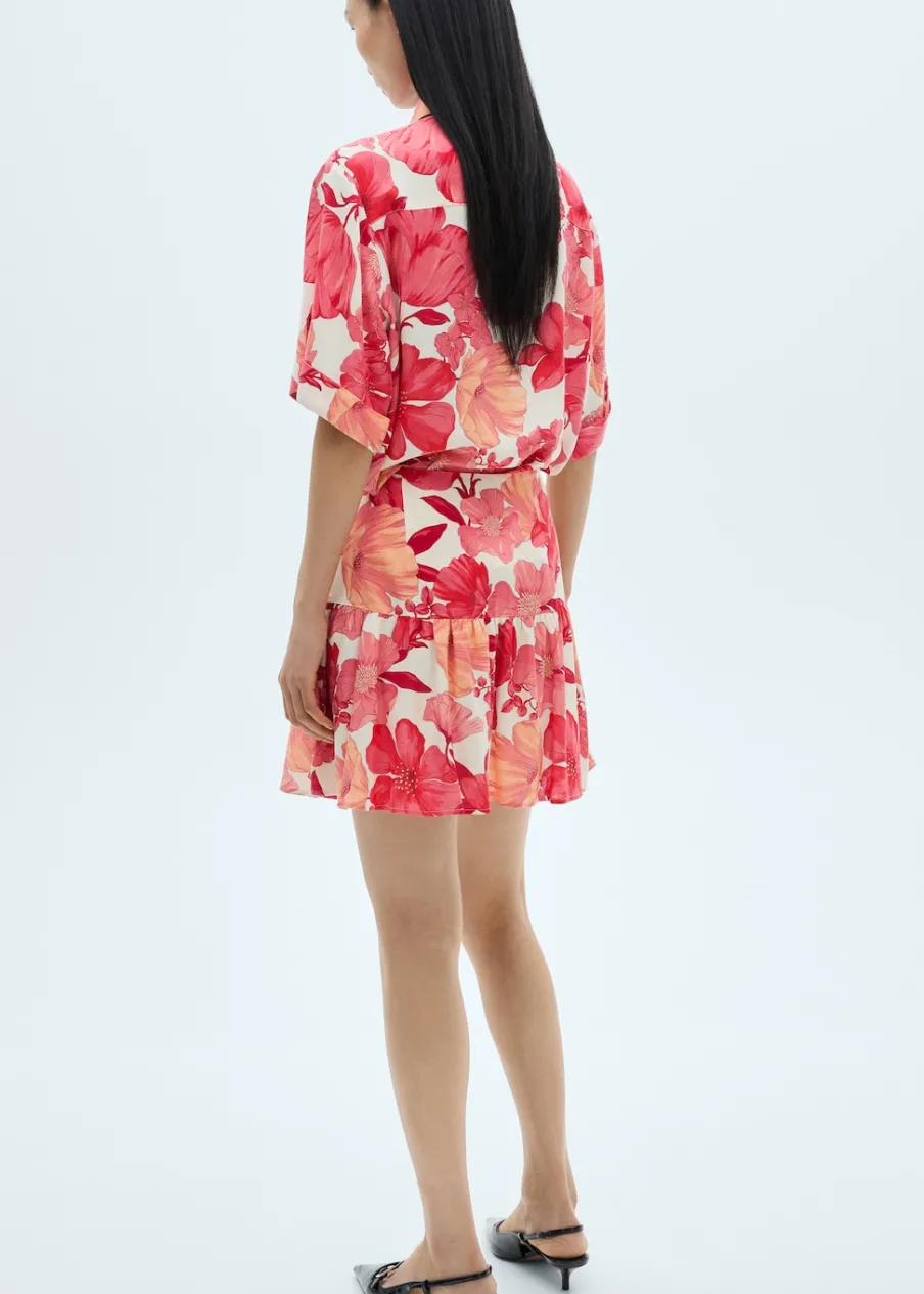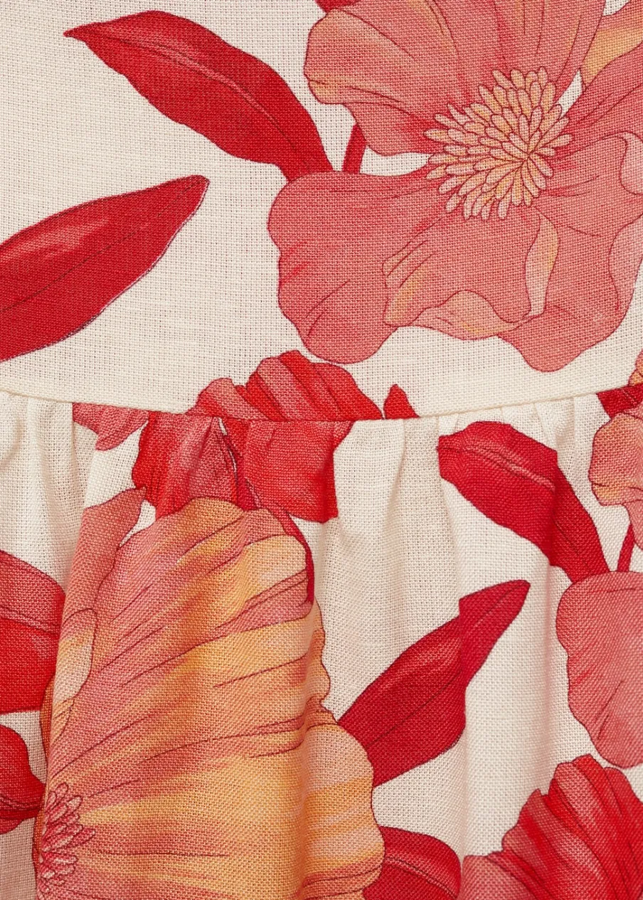 Tkanina z mieszanki lnu. Model evasé. Krótki krój. Wzór w kwiaty. Średni stan. Zapięcie na zamek z boku.