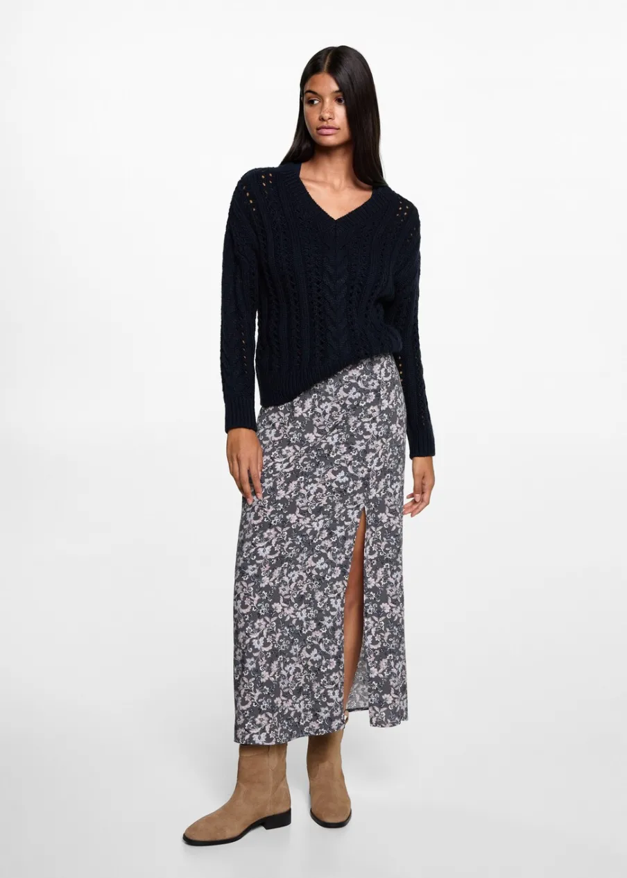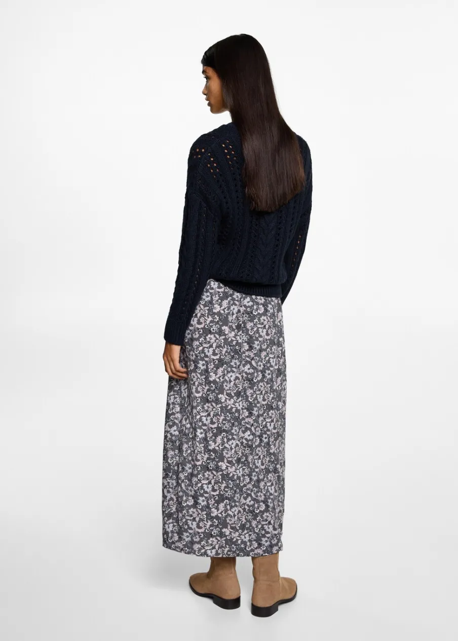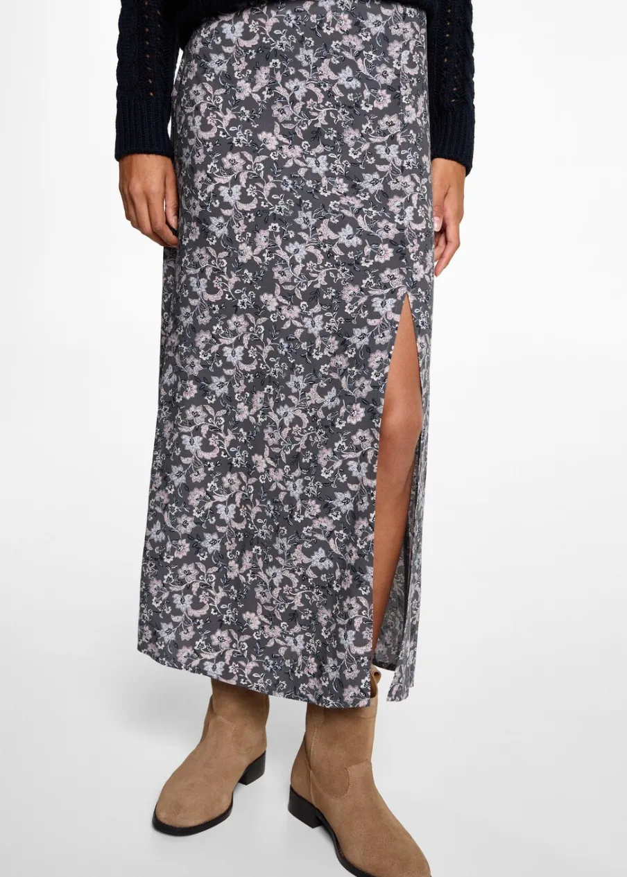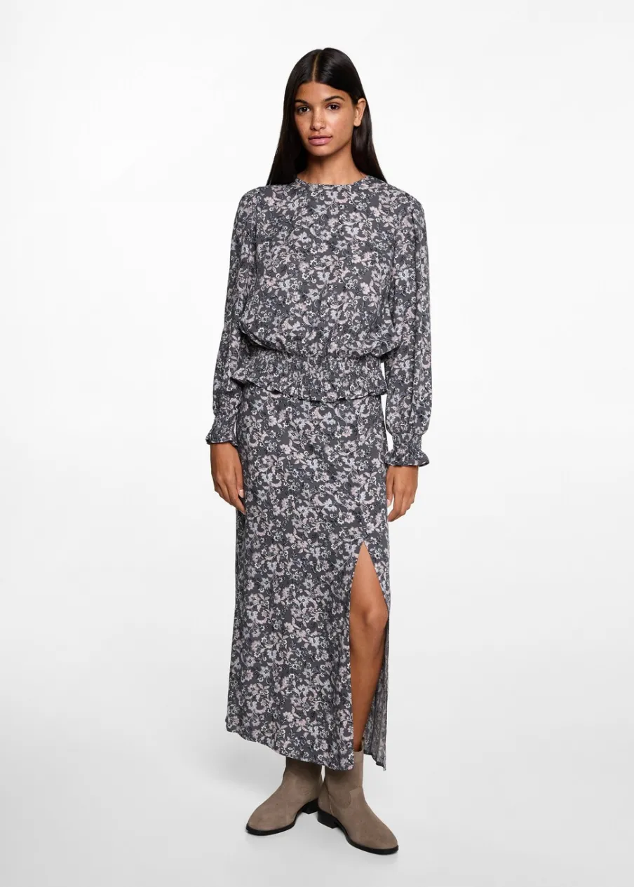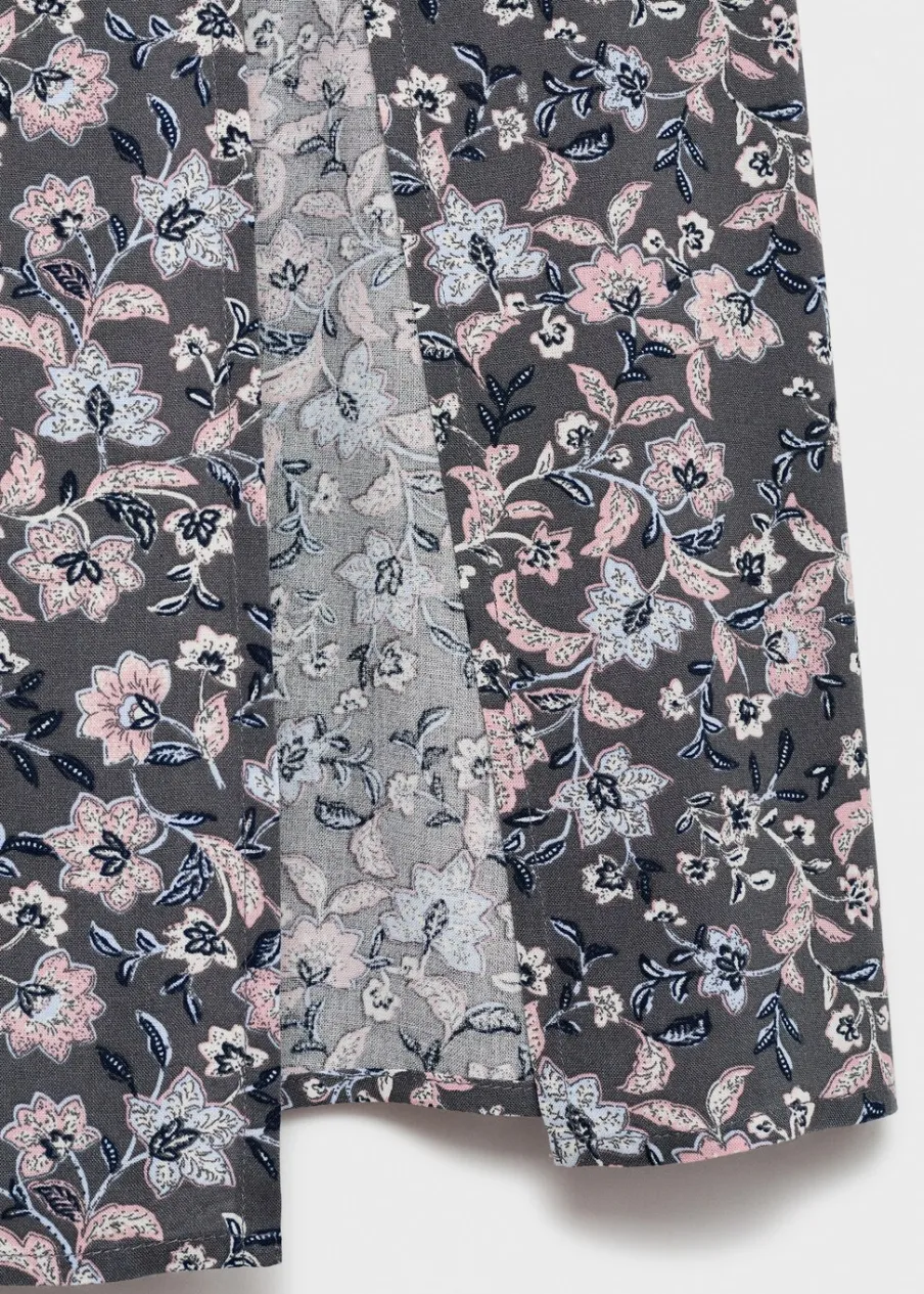 Dostępny zestaw total look. Model prosty. Kwiatowy wzór. Krój do kolan. Rozcięcie u dołu. Modelka ma 172 cm wzrostu i nosi rozmiar M. Elastyczny pas.