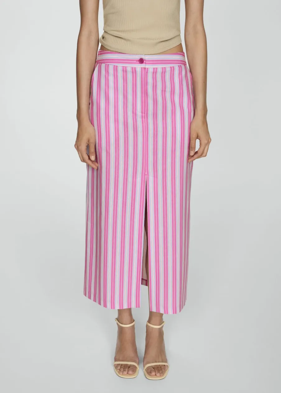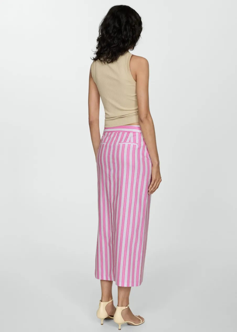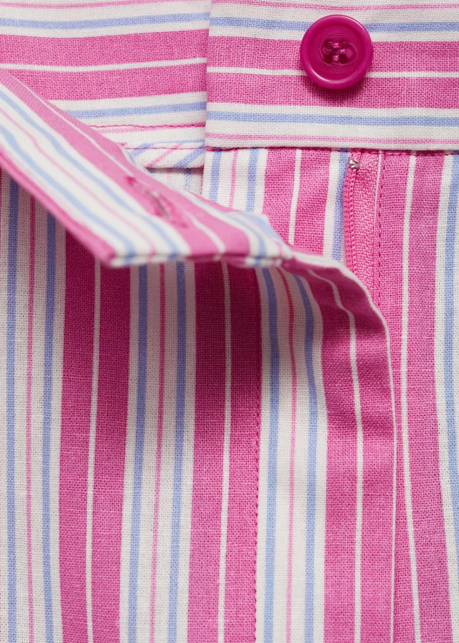 Tkanina mieszana z ramii i bawełny. Krój do kolan. Model prosty. Wzór w pasy. Dwie kieszenie boczne. Dwie wpuszczane kieszenie z tyłu. Rozporek z przodu. Sezon festiwalowy. Zapięcie na zamek i guzik z przodu.