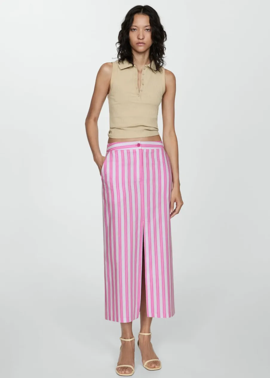 OpisTkanina mieszana z ramii i bawełny. Krój do kolan. Model prosty. Wzór w pasy. Dwie kieszenie boczne. Dwie wpuszcz…