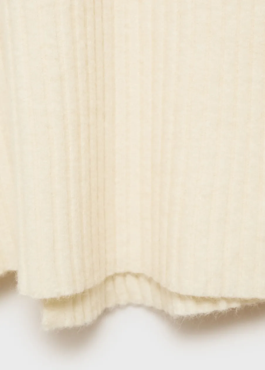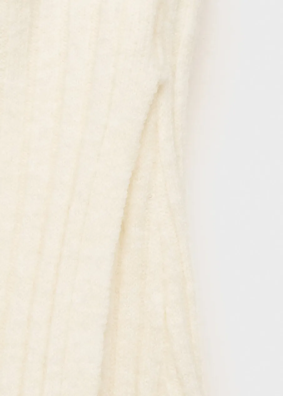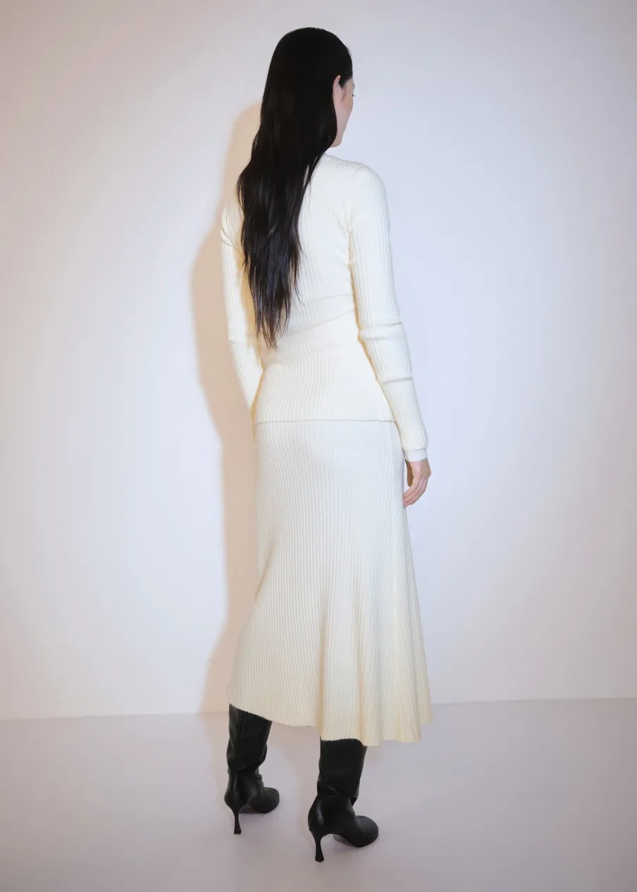 Dzianinowa tkanina. Ściągaczowa tkanina. Model zakładany. Model prosty. Krój do kolan. Elastyczny pas. Wiązanie z boku. Modelka ma 175 cm wzrostu i nosi rozmiar S/36. Total look.