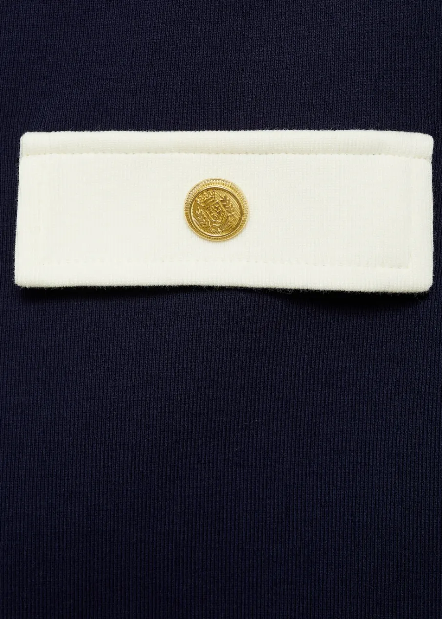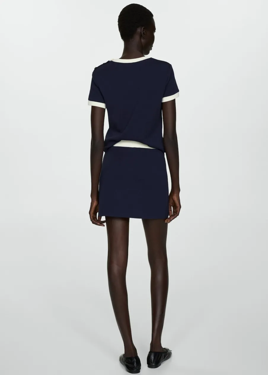 Dzianinowa tkanina. Krótki krój. Model evasé. Model dostępny w wersji gładkiej lub ze wzorem. Struktura w pasy. Dwie przednie kieszenie z patką i guzikiem. Ozdobne guziki. Kontrastowe lamówki. Tkanina z 100% bawełny.