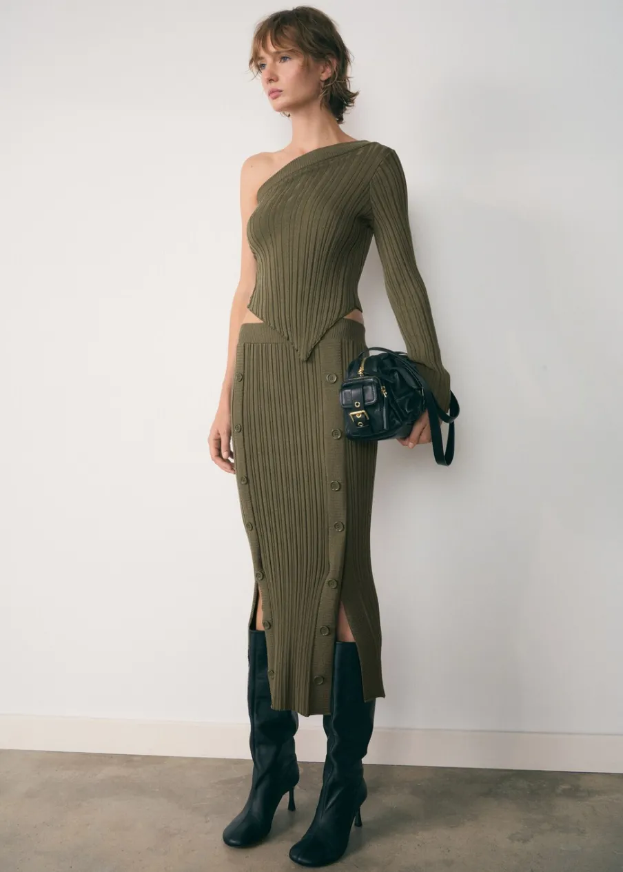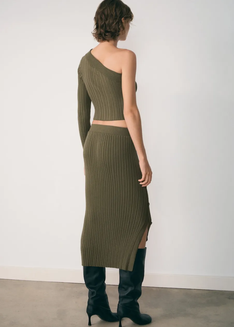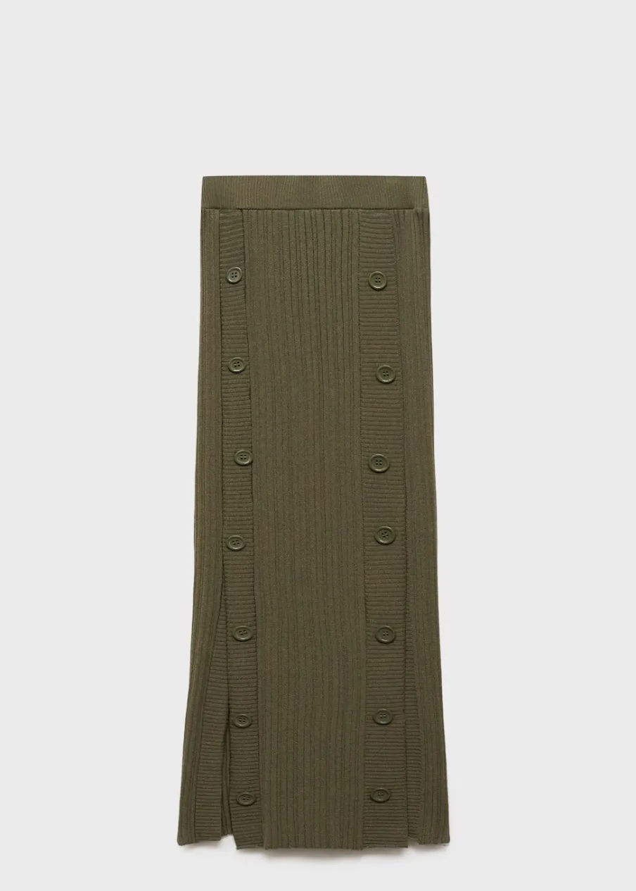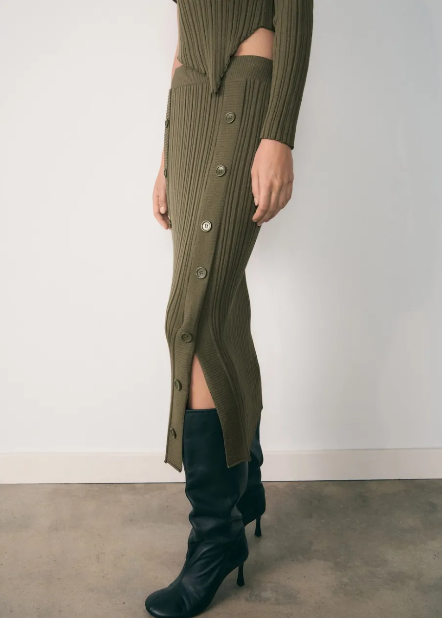 Ściągaczowa dzianina. Krój do kolan. Model wcięty. Średni stan. Elastyczny pas. Zapięcie z przodu na guziki. Modelka ma 178 cm wzrostu i nosi rozmiar S/36. Total look.