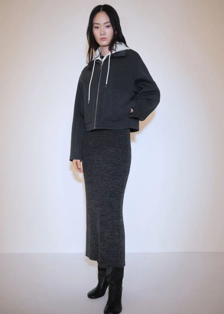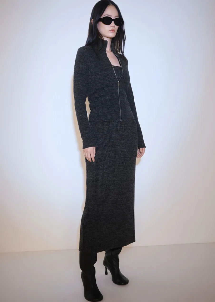 Dzianinowa tkanina. Krój do kolan. Model wcięty. Rozcięcie z tyłu u dołu. Bez zapięcia. Elastyczny pas. Total look. Modelka ma 175 cm wzrostu i nosi rozmiar S/36.