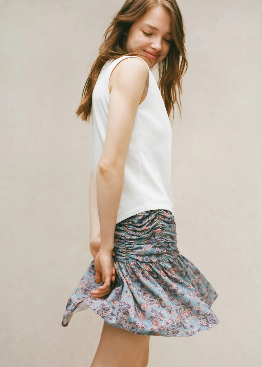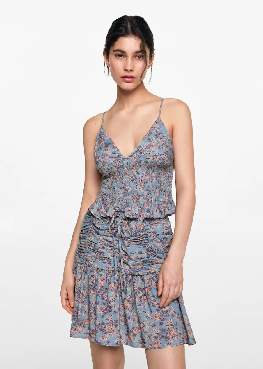 Krótki krój. Wzór w kwiaty. Dostępny zestaw total look. Elastyczny pas. Zapięcie ze sznurkiem do regulacji.