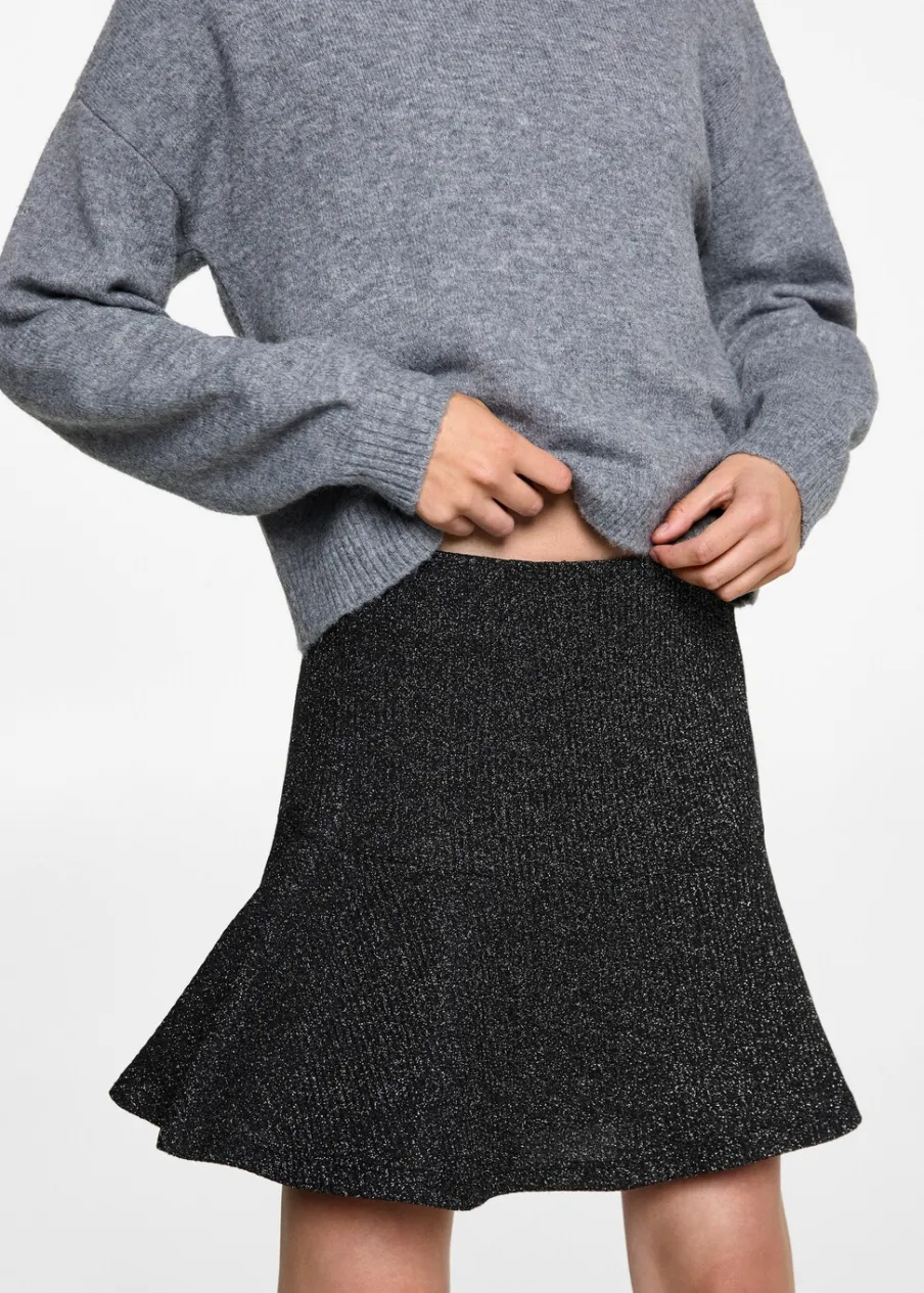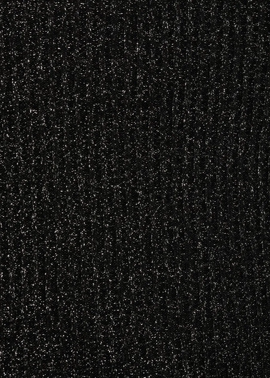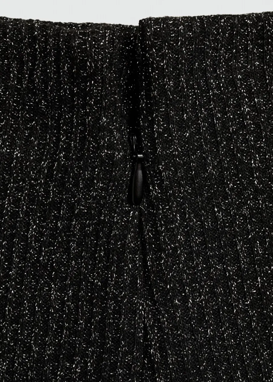 Kolekcja wieczorowa i imprezowa. Ściągaczowa dzianina. Średni stan. Krótki krój. Kryte zapięcie na zamek z boku. Zdjęcie modelki wygenerowano za pomocą sztucznej inteligencji. Tkanina z cienkiej dzianiny. Tkanina lureks. Metaliczny efekt. Model evasé.