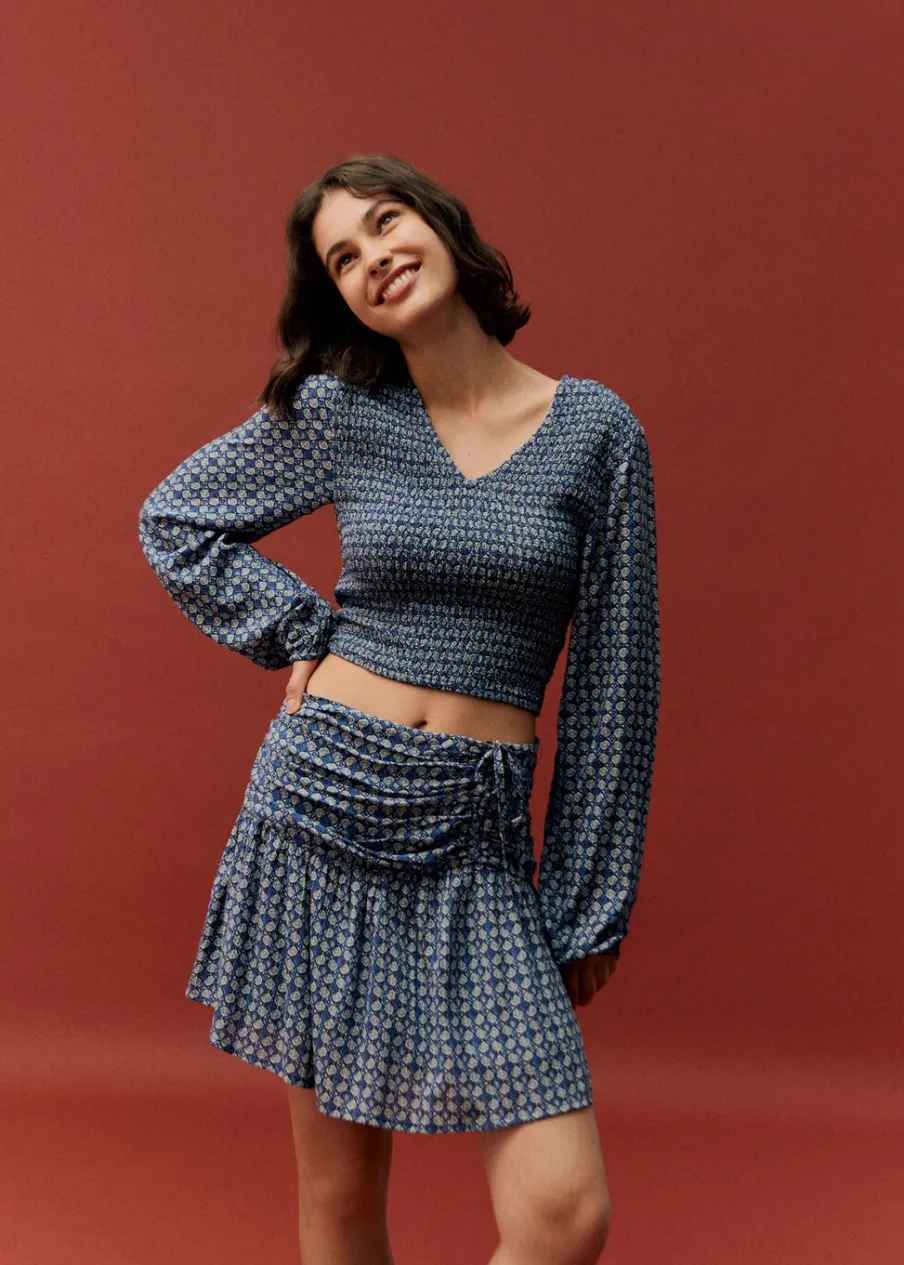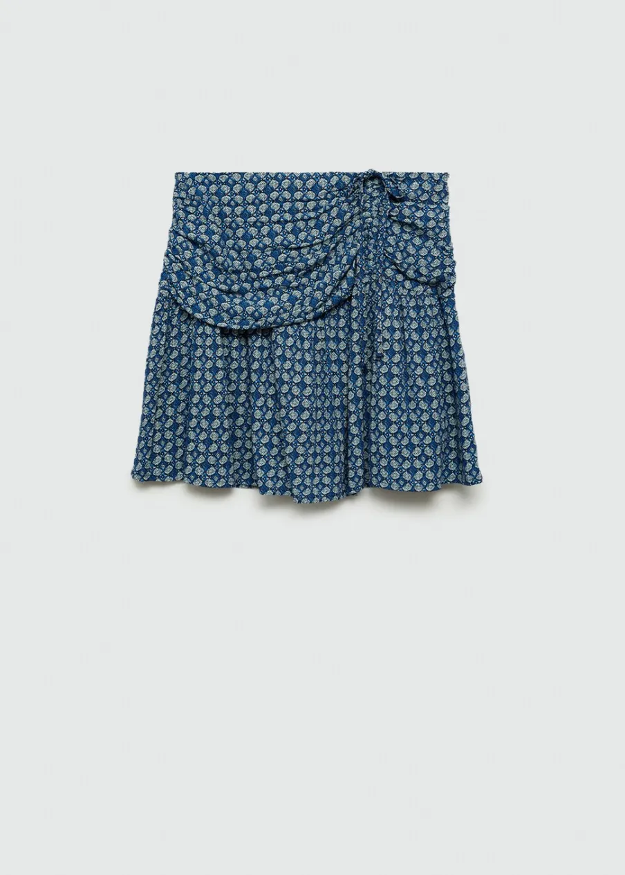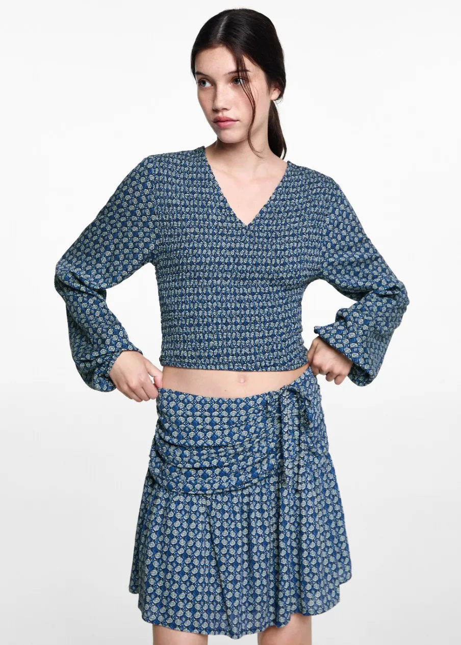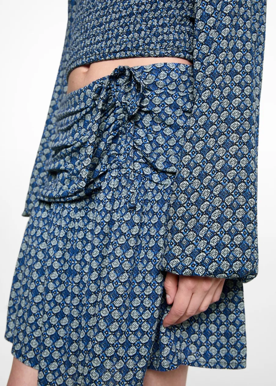 Total look. Lejąca tkanina. Krótki krój. Rozszerzany model. Marszczenie z boku z wiązaniem. Kryte zapięcie na zamek z boku. Nadruk.