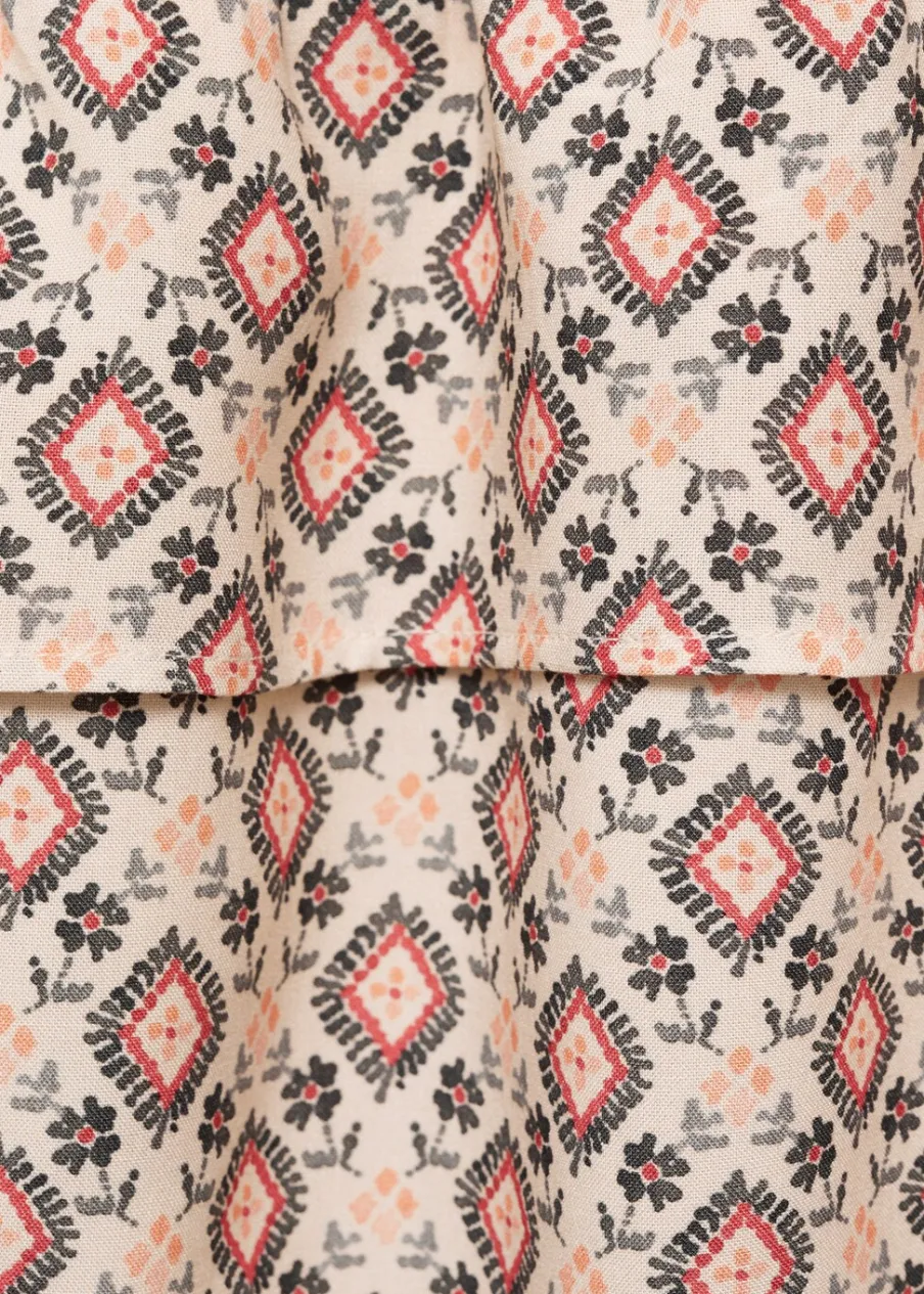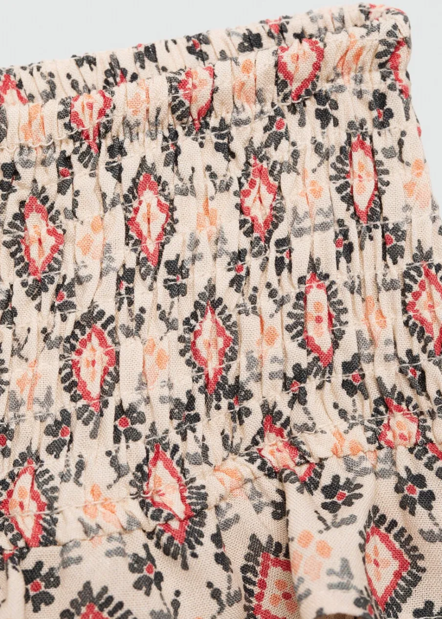 Model z falbankami. Ozdobne marszczenie. Elastyczna wstawka. Krótki krój. Bez zapięcia. Dostępny zestaw total look. Nadruk. Tkanina z wiskozy.