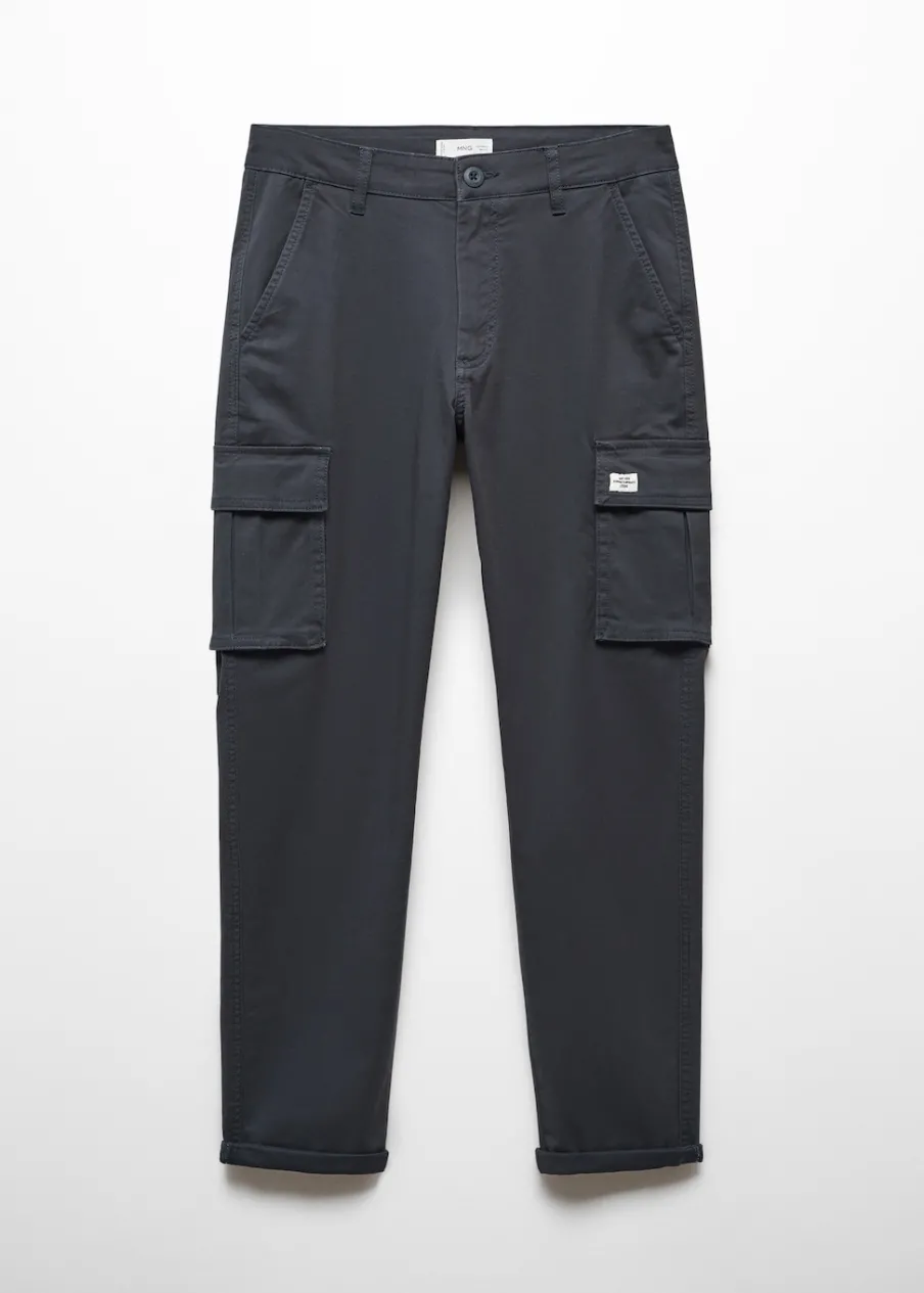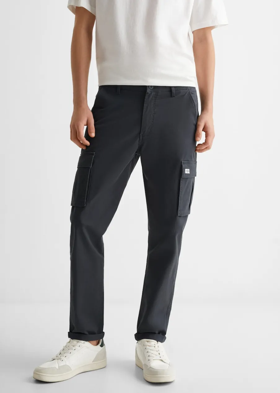 Tkanina bawełniana. Model prosty. Model długi. Dwie kieszenie. Dwie kieszenie cargo. Zapięcie na suwak i guzik.