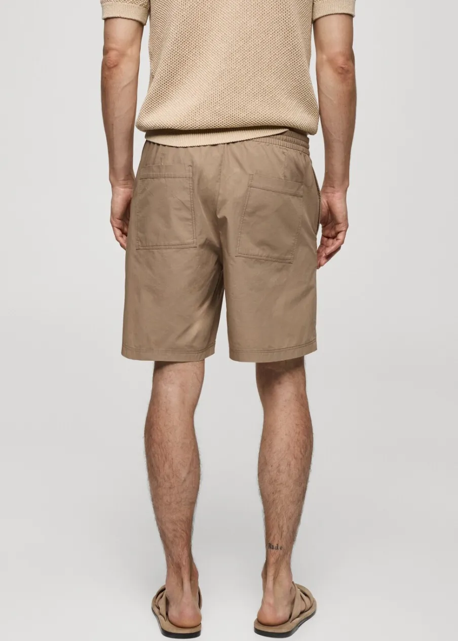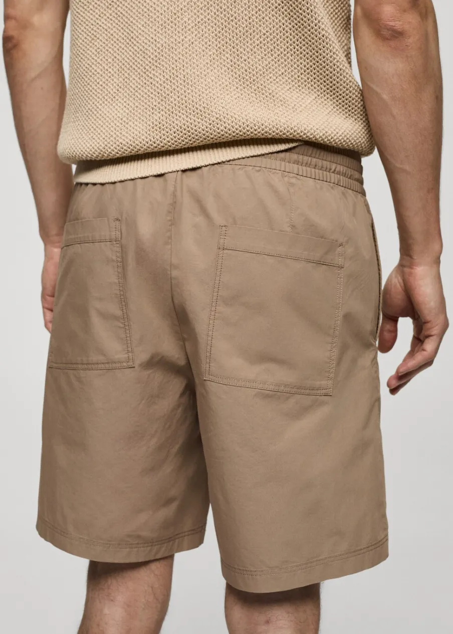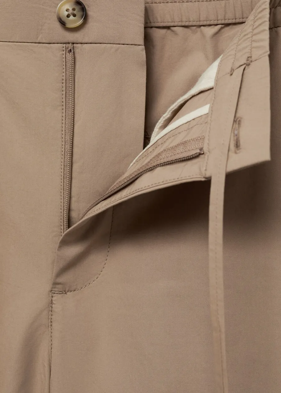 Elastyczny pas z regulowanym sznurkiem. Dwie kieszenie z przodu. Dwie kieszenie nakładane z tyłu. Model ma 185 cm wzrostu i nosi rozmiar 42. Zapięcie na zamek i guzik z przodu. Tkanina z 100% bawełny.