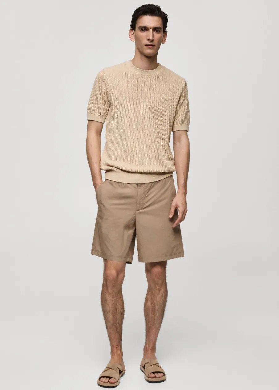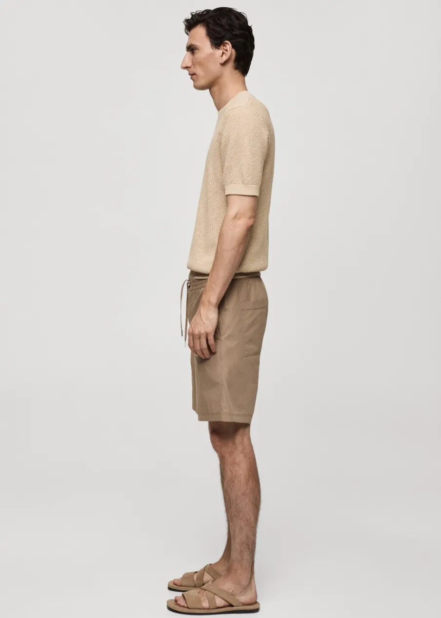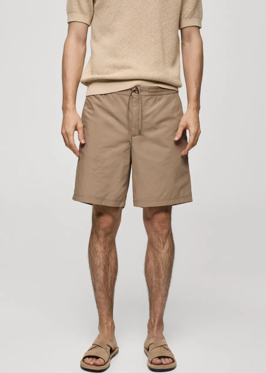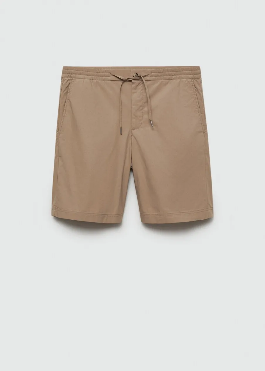 Elastyczny pas z regulowanym sznurkiem. Dwie kieszenie z przodu. Dwie kieszenie nakładane z tyłu. Model ma 185 cm wzrostu i nosi rozmiar 42. Zapięcie na zamek i guzik z przodu. Tkanina z 100% bawełny.