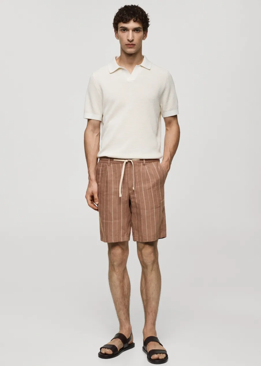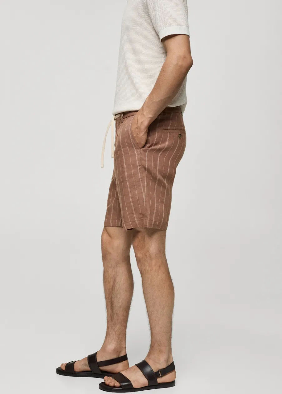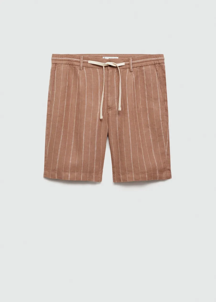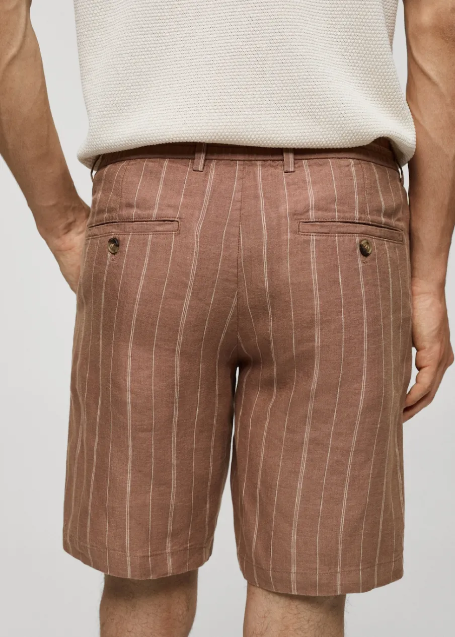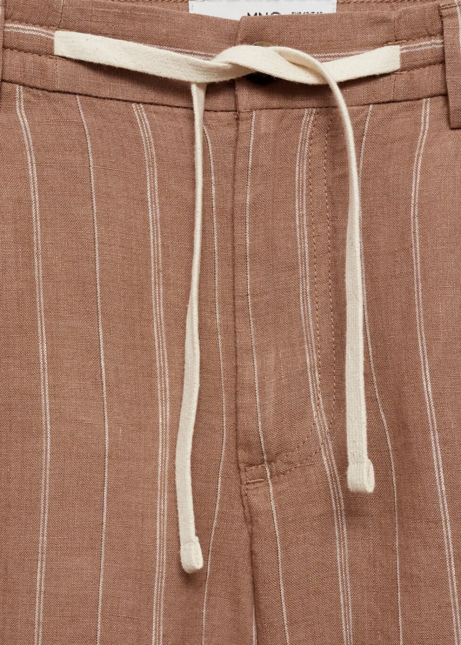 Tkanina z 100% lnu. Nadruk w pionowe paski. Elastyczny pas z regulowanym sznurkiem. Szlufki na pasek. Dwie kieszenie z przodu. Dwie wpuszczane kieszenie z guzikiem z tyłu. Model ma 185 cm wzrostu i nosi rozmiar 42. Zapięcie na zamek i guzik z przodu.