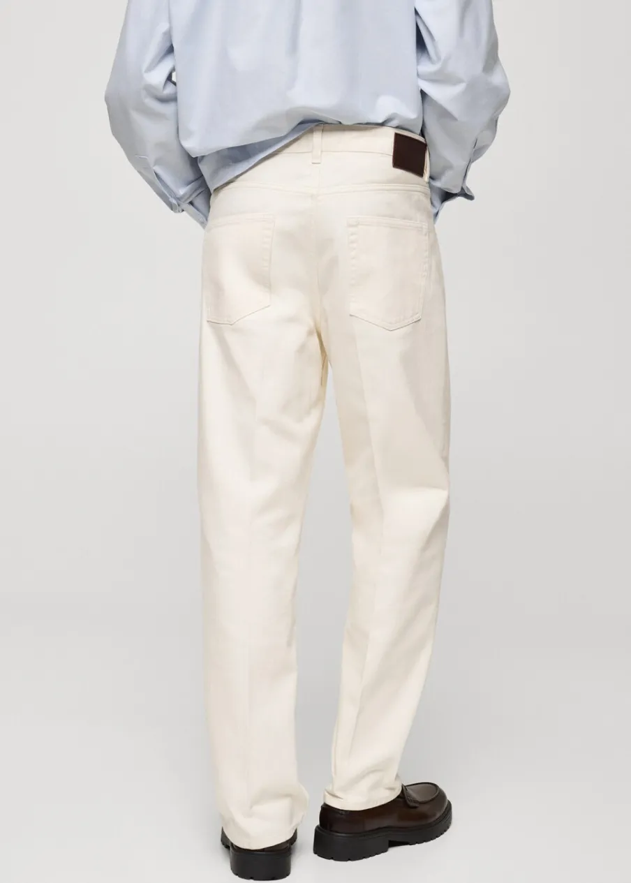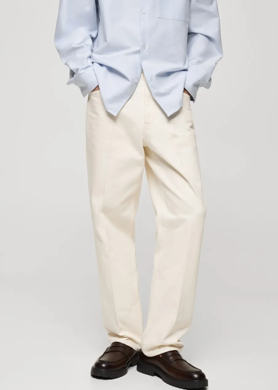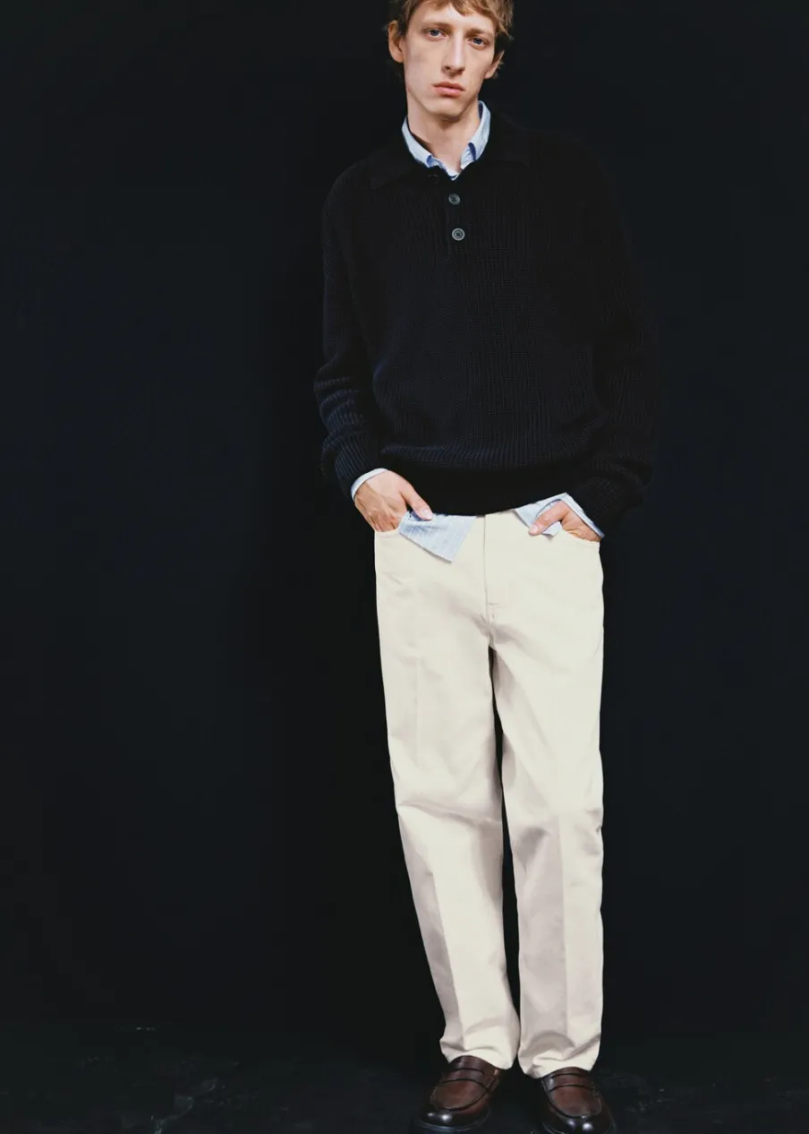 Relaxed fit. Średni stan. Model długi. Tkanina bawełniana w dżinsowym stylu. Kieszeń na bilon. Szlufki na pasek. Dwie kieszenie z przodu. Dwie kieszenie nakładane z tyłu. Model ma 190 cm wzrostu i nosi rozmiar 42. Zaprasowany kant. Zapięcie na zamek i guzik z przodu.